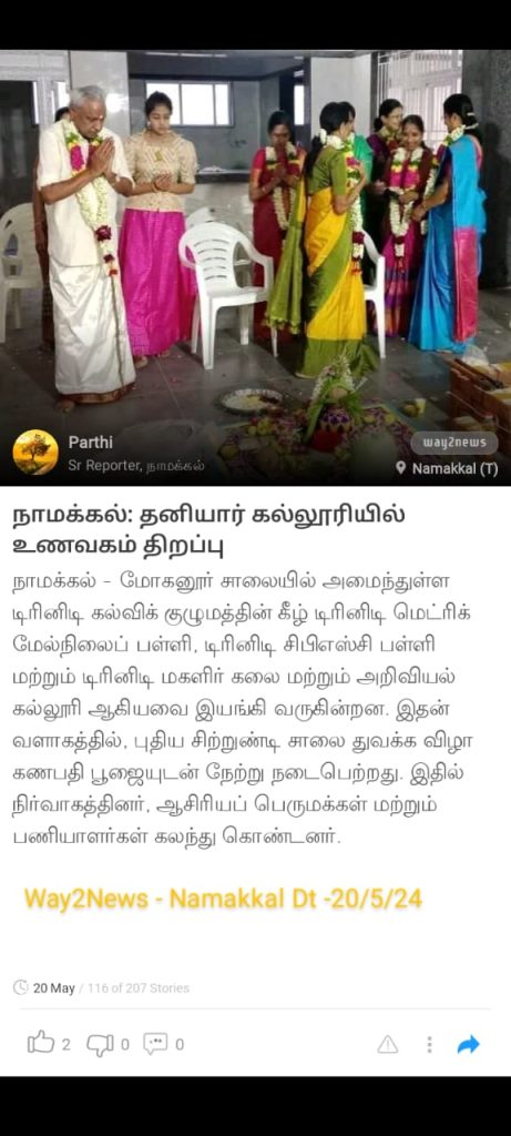 The Trinity Educational Institutions – Namakkal (Trinity Matric Higher Secondary School, Trinity International School, CBSE, and Trinity College for Women – Arts and Science), new modernized canteen’s inauguration function was held with the Ganapathy Pooja, Vaasthu Pooja, and Navagraha Shanti Pooja on May 19, 2024 (Sunday) at 5.30 AM