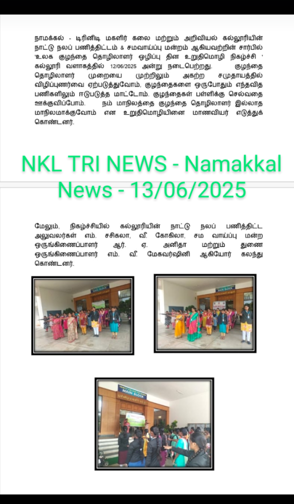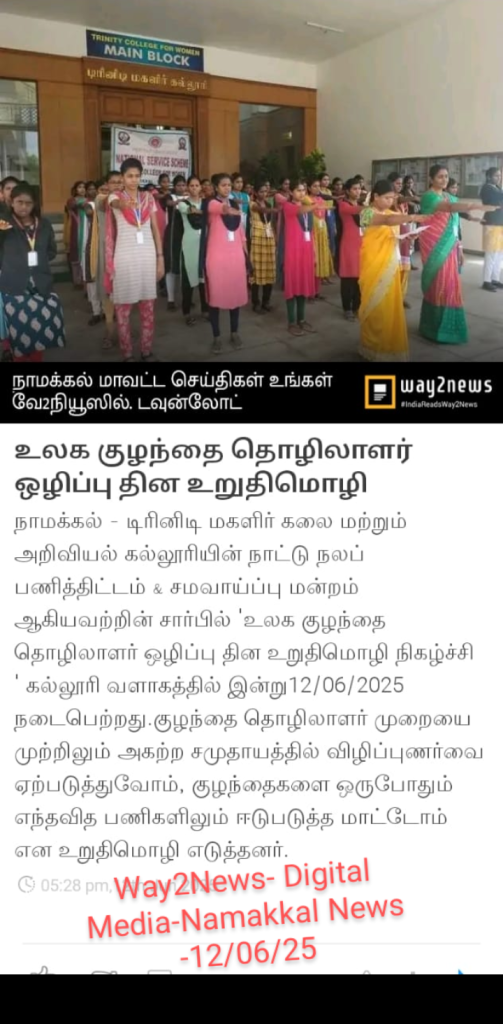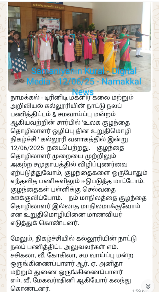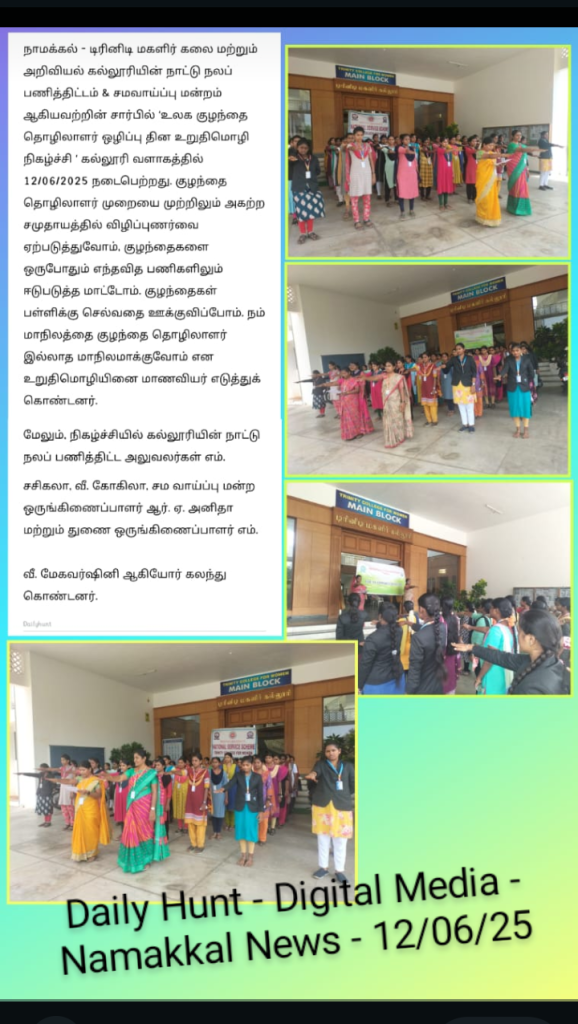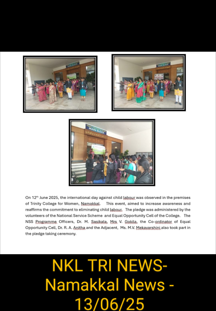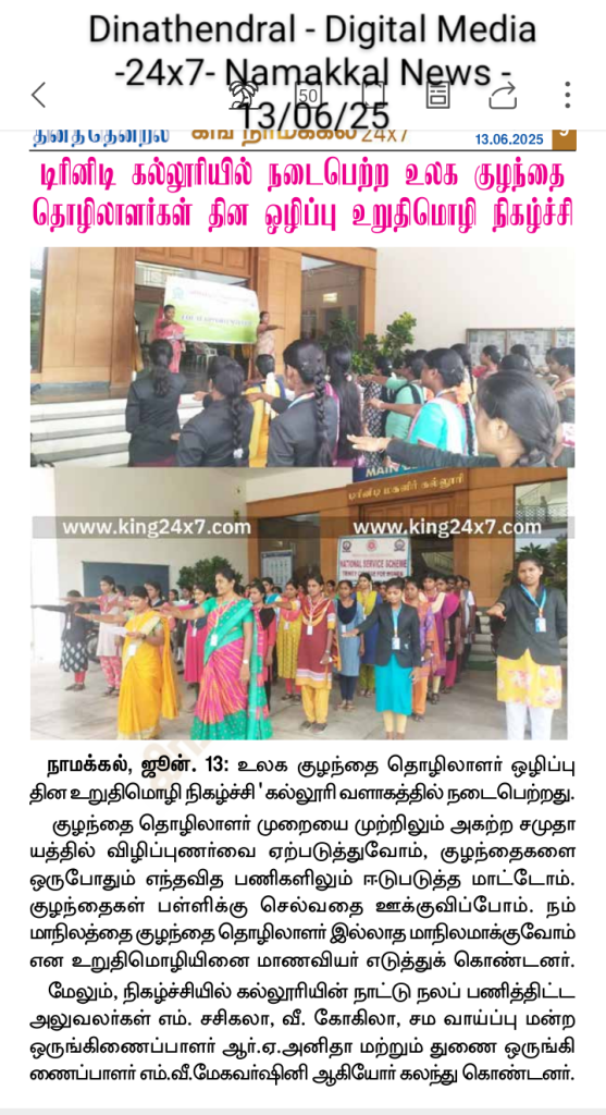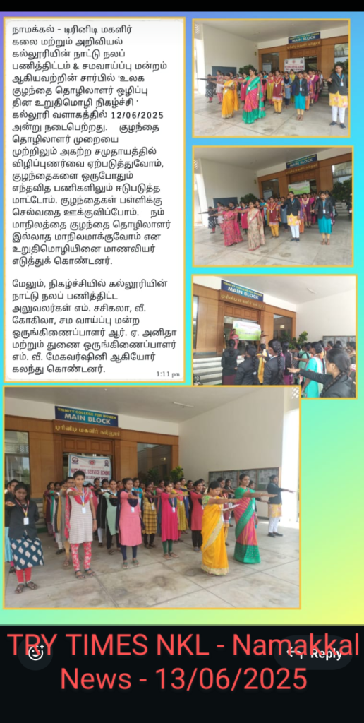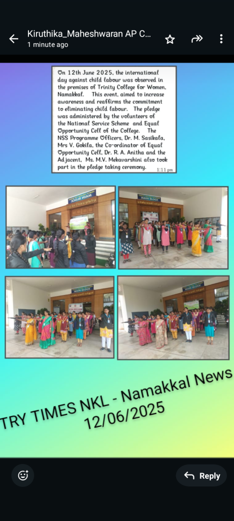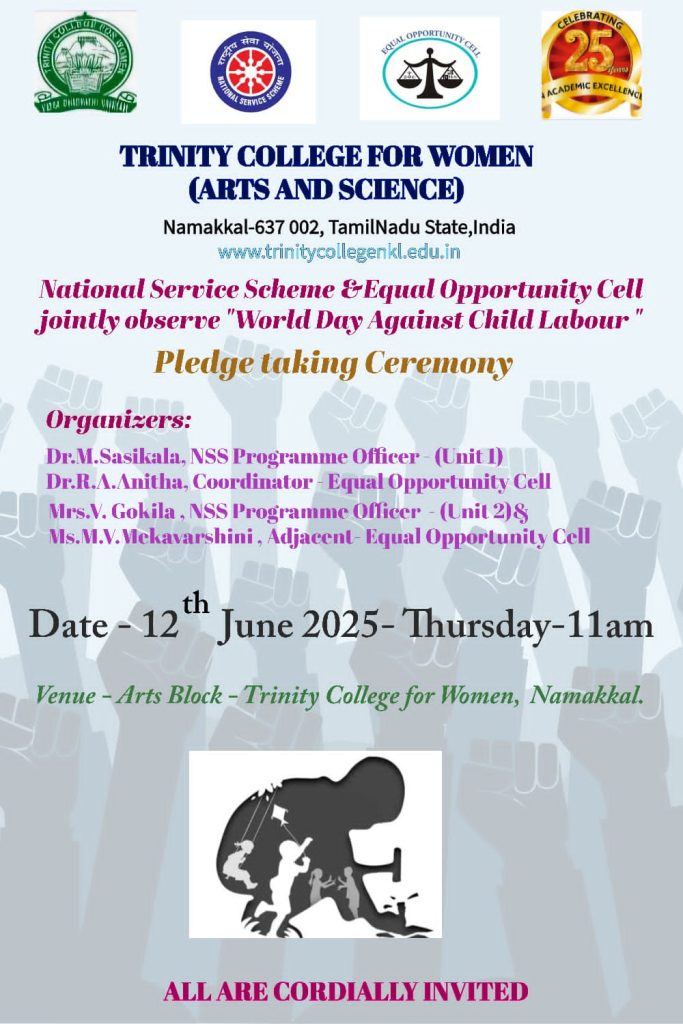 The Trinity Women’s Forum, National Service Scheme, Youth Red Cross, Red Ribbon Club, Equal Opportunity Cell and Unnat Bharat Abhiyan Cell of Trinity College for Women, Namakkal organized a programme titled “World Day against Child Labour” on 12th June 2025 in the College campus. Dr. R.A. Anitha, Coordinator, Equal Opportunity Cell of the College, read the pledge on international day against child labour”. The pledge was repeated by all the students’ participants.