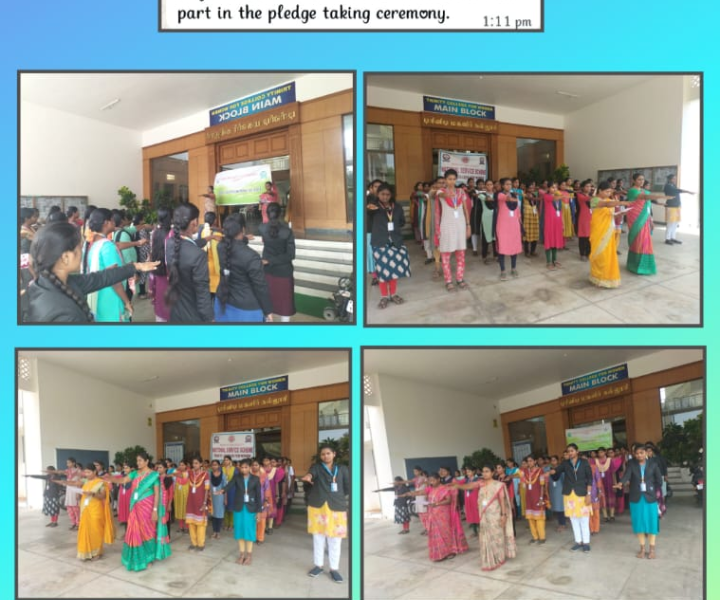 The NSS Programme Officers, Dr. M. Sasikala, Mrs. V. Gokila, The YRC Programme Officer, Mrs. V. Kalaivani, The RRC Programme Officer, Dr. S. Kalaivani, The Coordinator of Trinity Women’s Forum, Mrs. R. Rupa, and Mrs. S. Hemalatha, Coordinator – Unnat Bharat Abhiyan Cell were also present in that pledge taking ceremony.