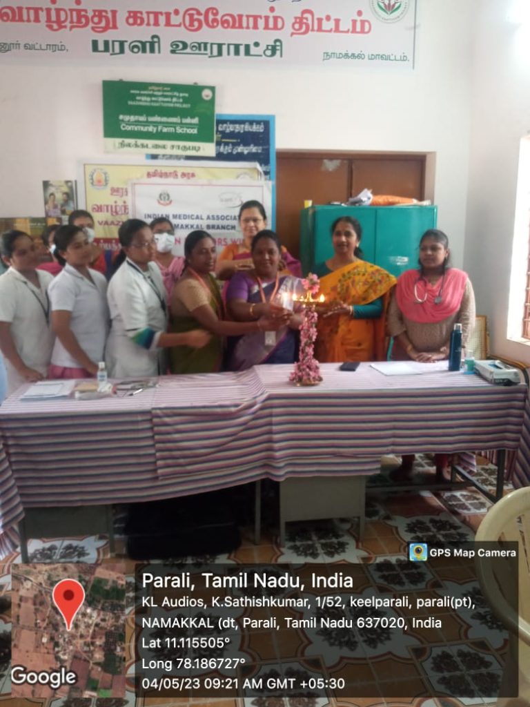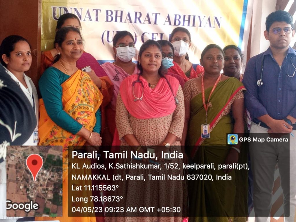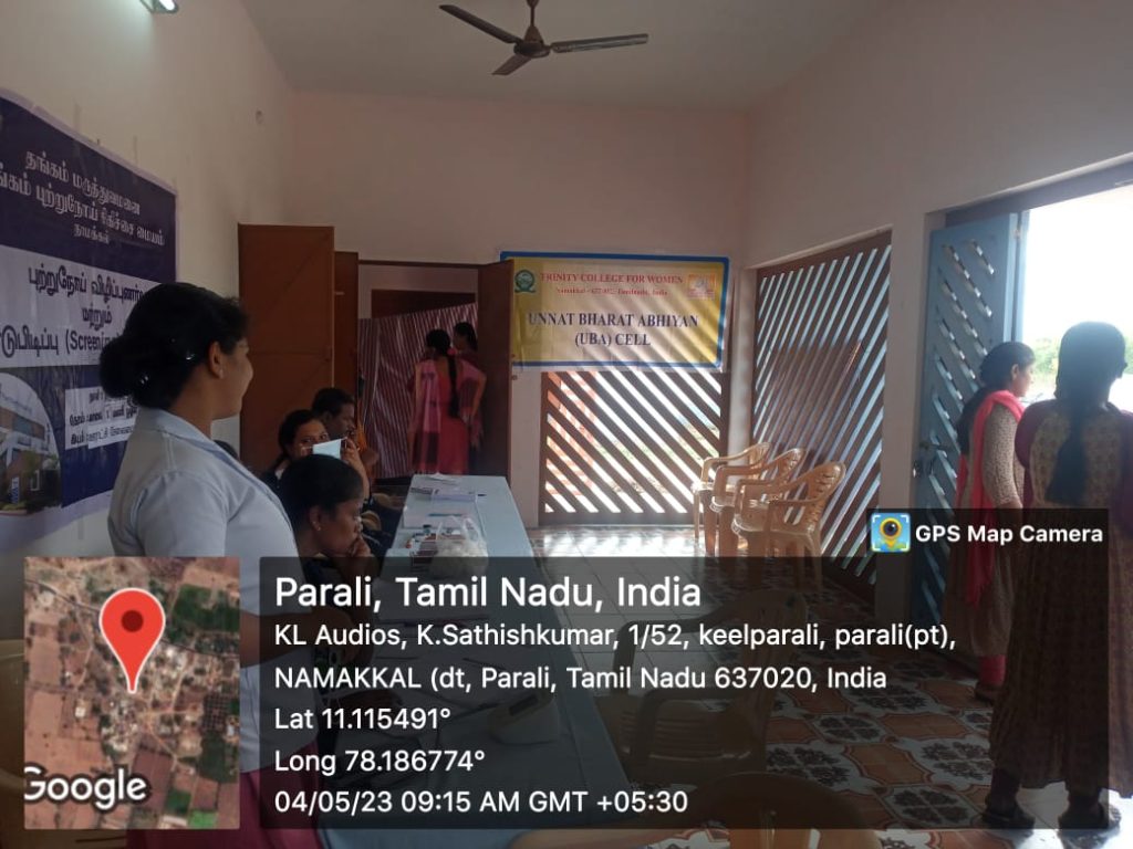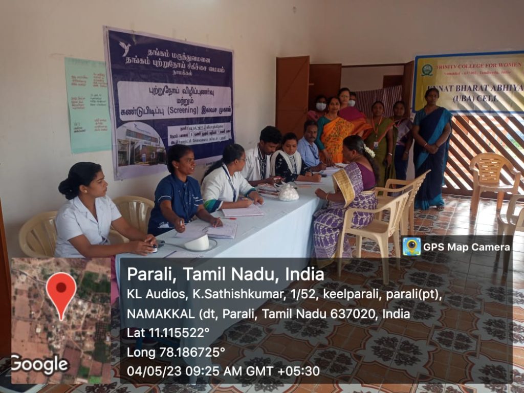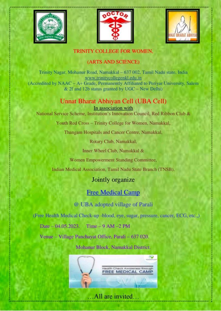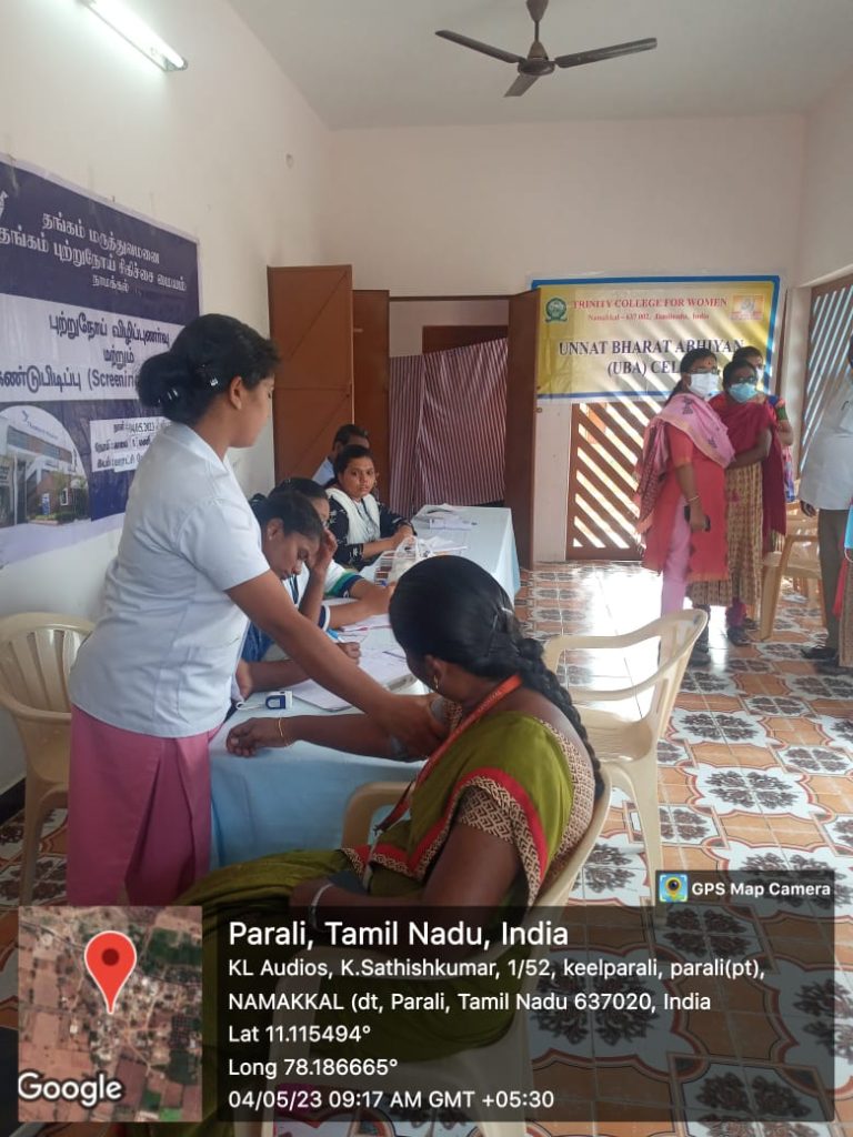 The Unnat Bharat Abhiyan Cell in association with the National Service Scheme, Youth Red Cross, Red Ribbon Club and Institution’s Innovation Cell of Trinity College for Women, Namakkal, Thangam Hospitals and Cancer Centre, Namakkal, Rotary Club, Namakkal, Inner Wheel Club, Namakkal and Women Empowerment Standing Committee, Indian Medical Association, Tamil Nadu state Branch organized a free medical camp in the UBA adopted village of Parali (Mohanur Panchayat Union, Valayapatti Via, Namakkal District) on 04.05.2023.