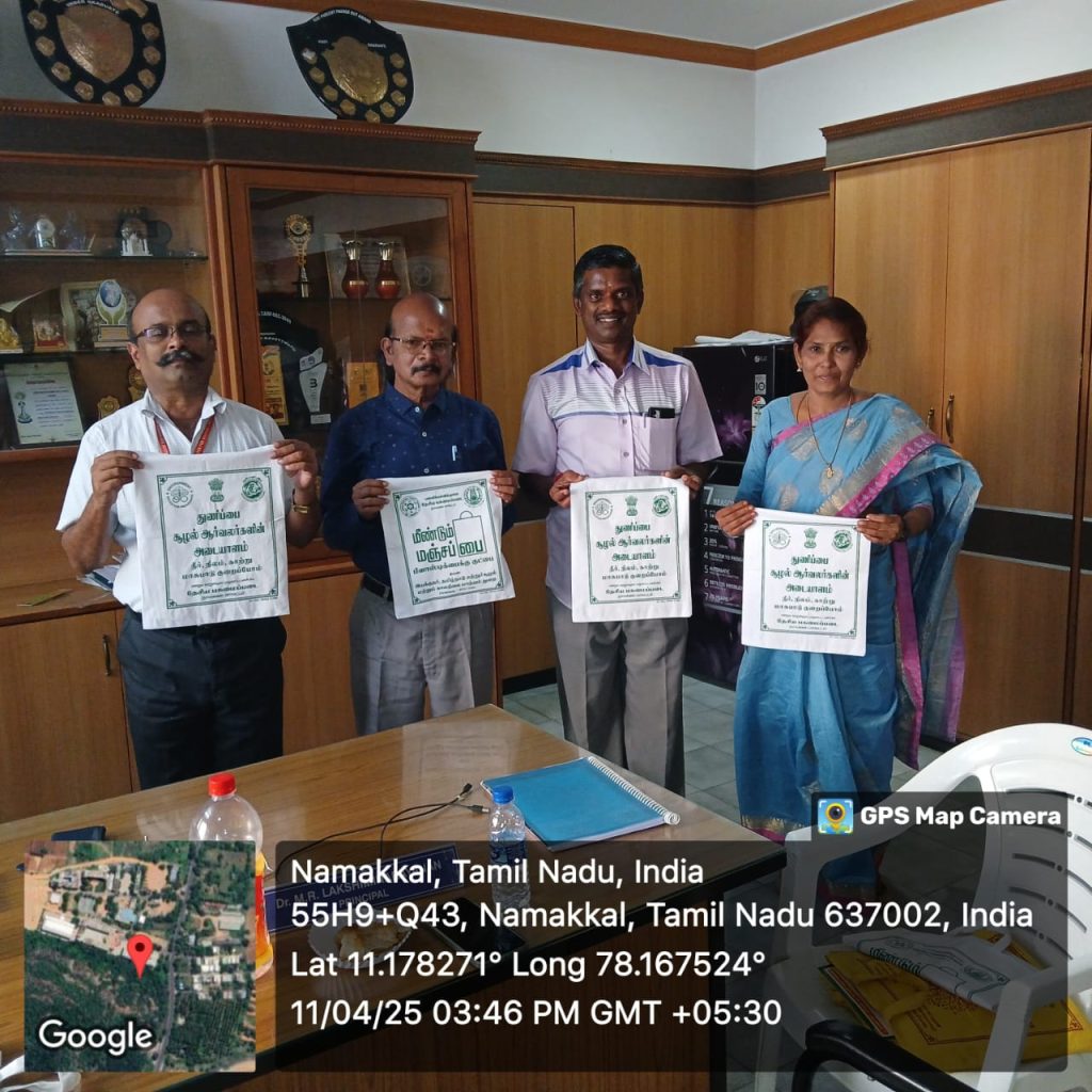 Plastic and polythene bags have become a serious environmental concern on account of their accumulation in our atmosphere. To ameliorate awareness and induce the behavior of cloth bag usage instead of plastic bags in students, the Unnat Bharat Abhiyan Cell, in support of the National Green Corps, Namakkal District, distributed cloth bags to the students of the College on 11th April 2025.
