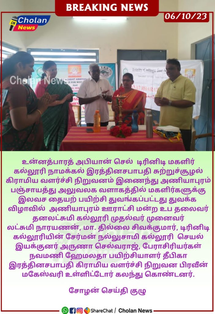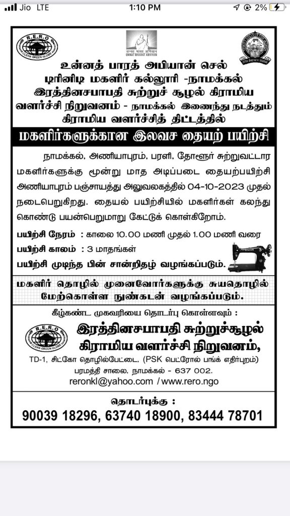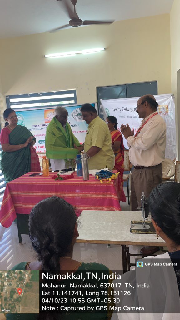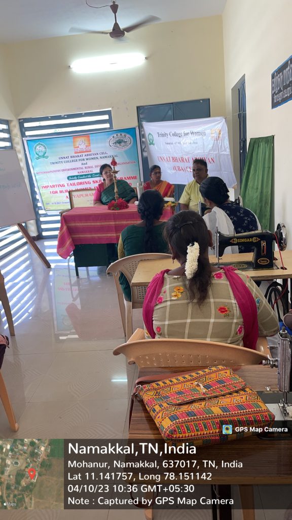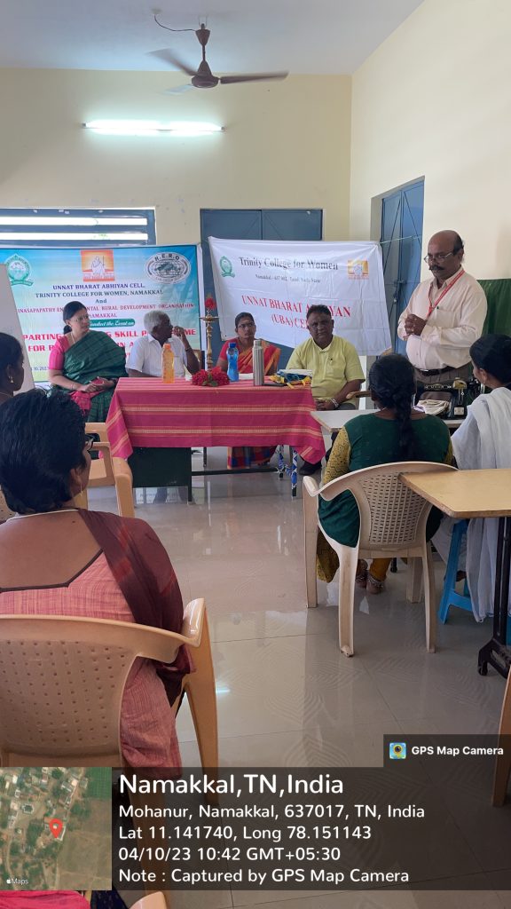The Unnat Bharat Abhiyan Cell, Trinity College for Women, Namakkal, and Rathinasabapathy Environmental Rural Development Organisation, Namakkal, are going to jointly conduct the 3-month event on “Imparting tailoring skill programmes for rural women in and around Aniyapuram Village” from October 4, 2023, to December 31, 2023, in Aniyapuram, Mohanur Taluk, Namakkal District. The training period is three months. On this subject, an inauguration function was held on October 4, 2023, at the Village Panchayat Office, Aniyapuram.