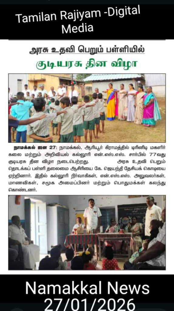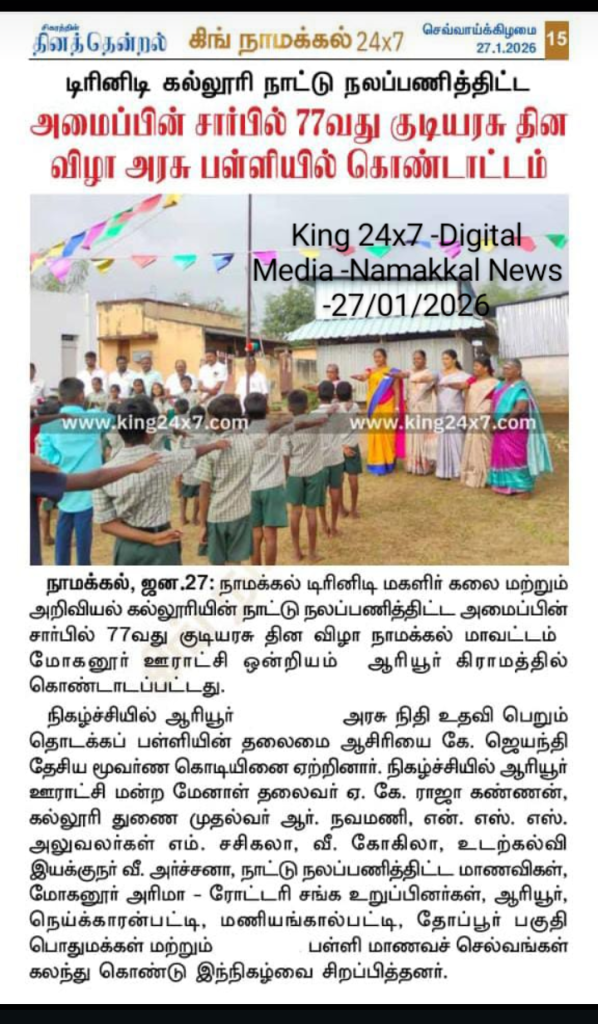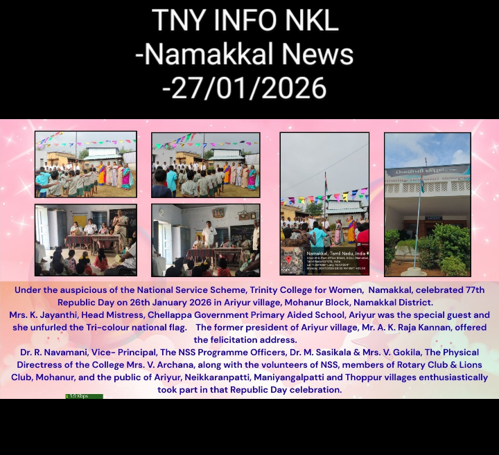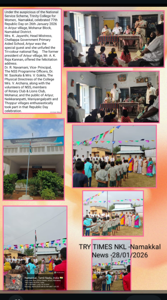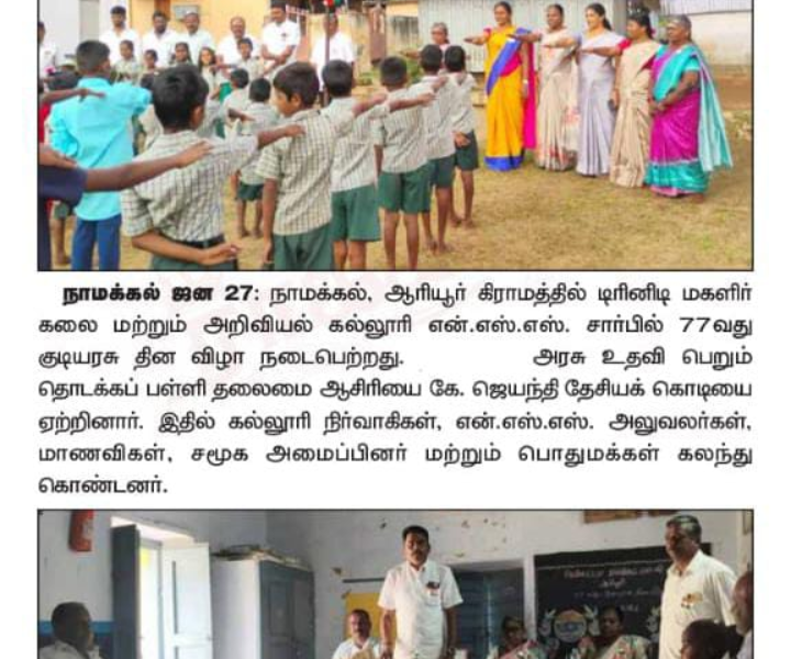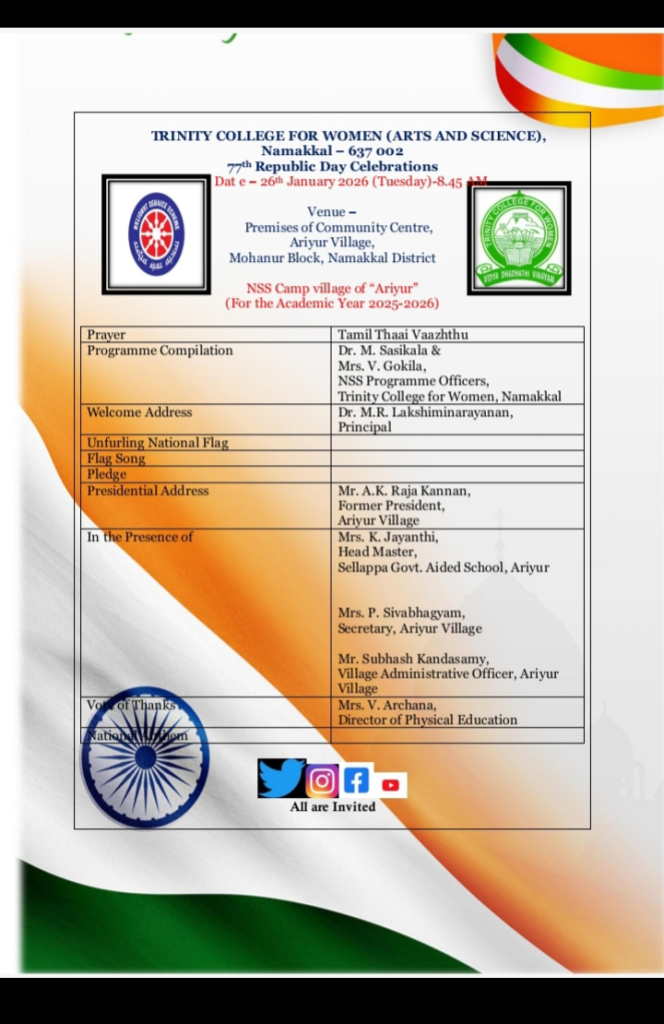 The volunteers, as well as Programme Officers of the National Service Scheme, Trinity College for Women, Namakkal, celebrated 77th Republic Day with great zeal and enthusiasm in the village of Ariyur, Mohanur Taluk, Namakkal District on 26th January 2026.