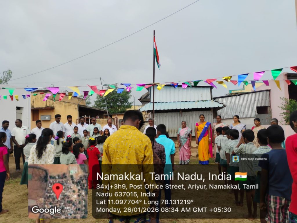 Mrs. K. Jayanthi, Head Mistress, Sellappa Government Aided Primary School, Ariyur unfurled the National Flag. She highlighted the importance of our constitution in granting us basic freedoms and guiding us in our duties in India.