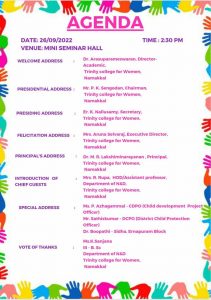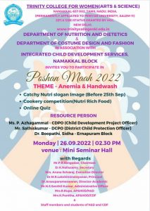 The Department of Nutrition and Dietetics & Costume Design and Fashion, Trinity College for Women, Namakkal in association with Integrated Child Development Services, Namakkal District conducted a one day programme entitled “Poshan Maah 2022” (Theme – Anemia and Handwash) on 26th September 2022.