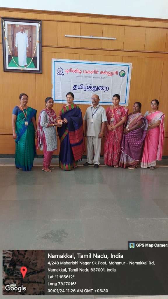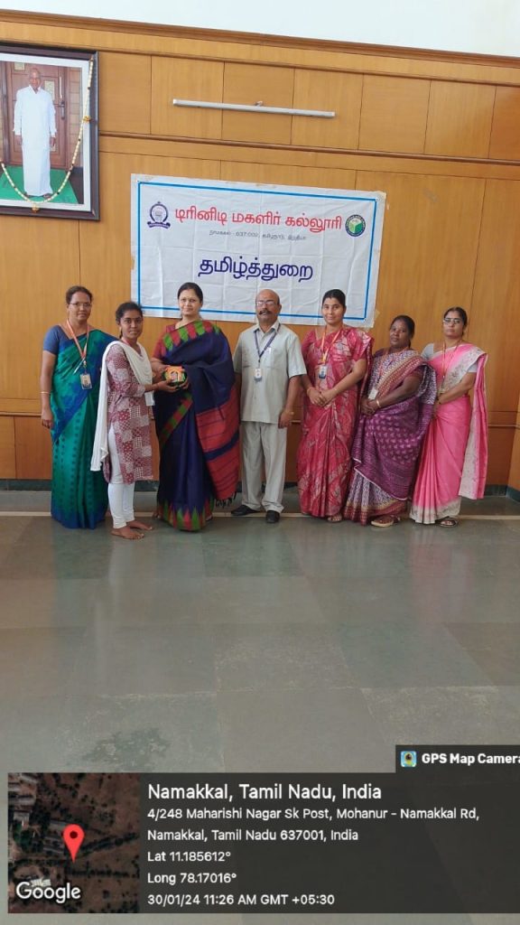 Dr. M.R. Lakshiminarayanan, Principal, The HOD’s of Tamil Dr. T.K.Anuradha & Dr. R. Savithri, the faculty of Tamil Dr. A. Latha, Dr. B. Vishnupriya, Dr. C. Gobiya, Dr. R.A. Anitha, and Dr. N. Subalakshmi, Faculty of Tamil, Trinity College for Women, Namakkal were present on that occasion.