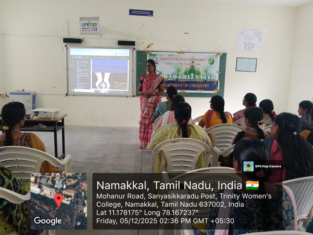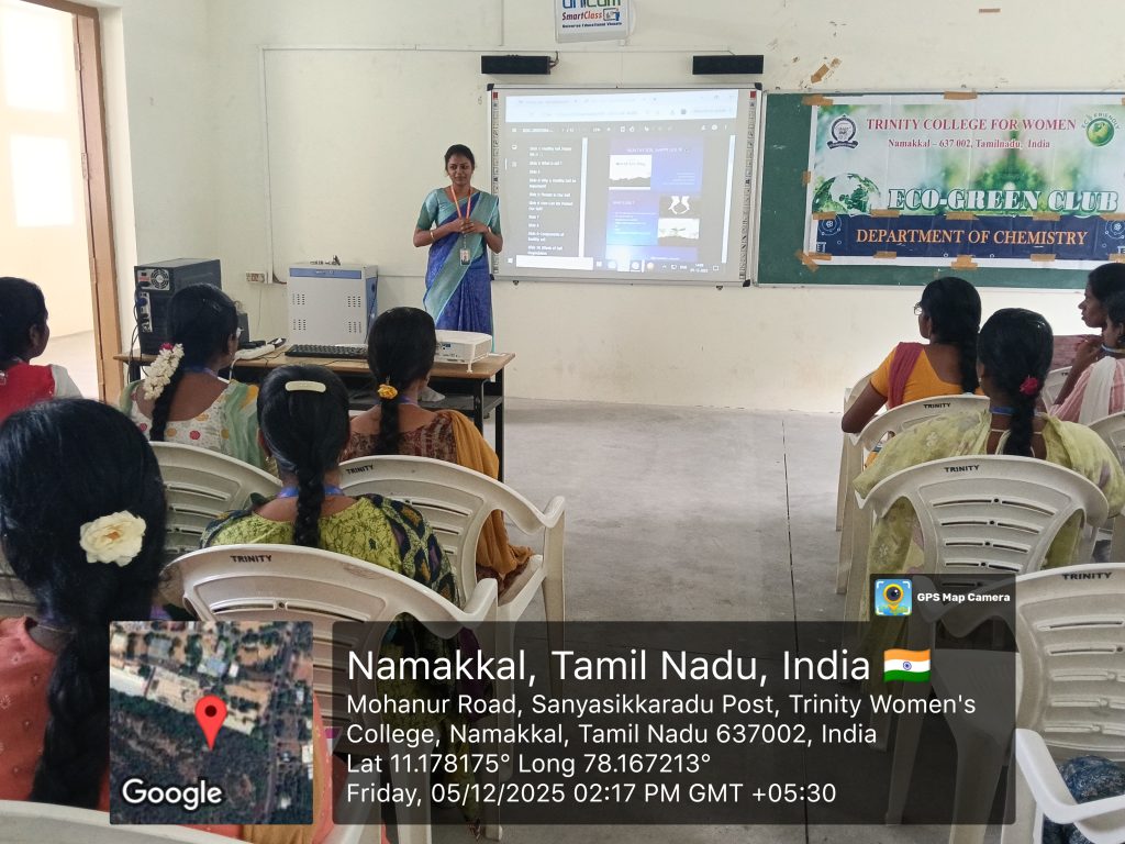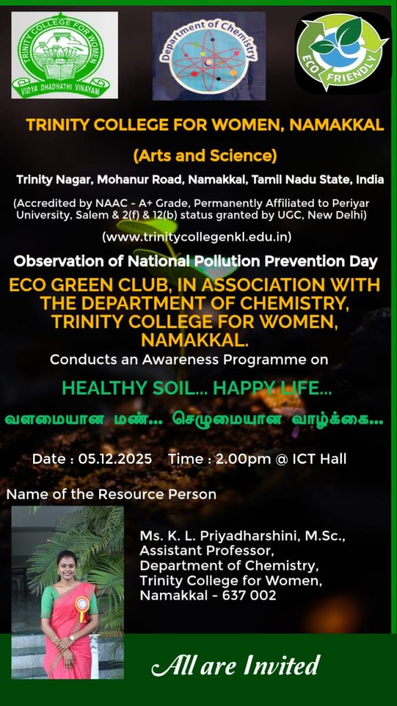 To create awareness of the role of soil, its protection and preservation, the Eco Green Club, in association with the department of Chemistry, Trinity College for Women, Namakkal observed “World Soil Day” on 05th December 2025. Ms. K.L.Priyadharshini, Assistant Professor of Chemistry, Trinity College for Women, Namakkal, delivered the topic titled “Healthy Soil….. Happy Life. ” (வளமையான மண்…….. செழுமையான வாழ்க்கை)