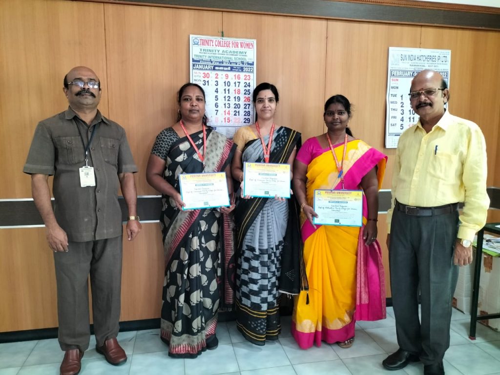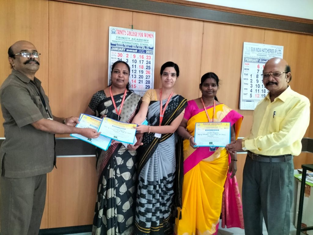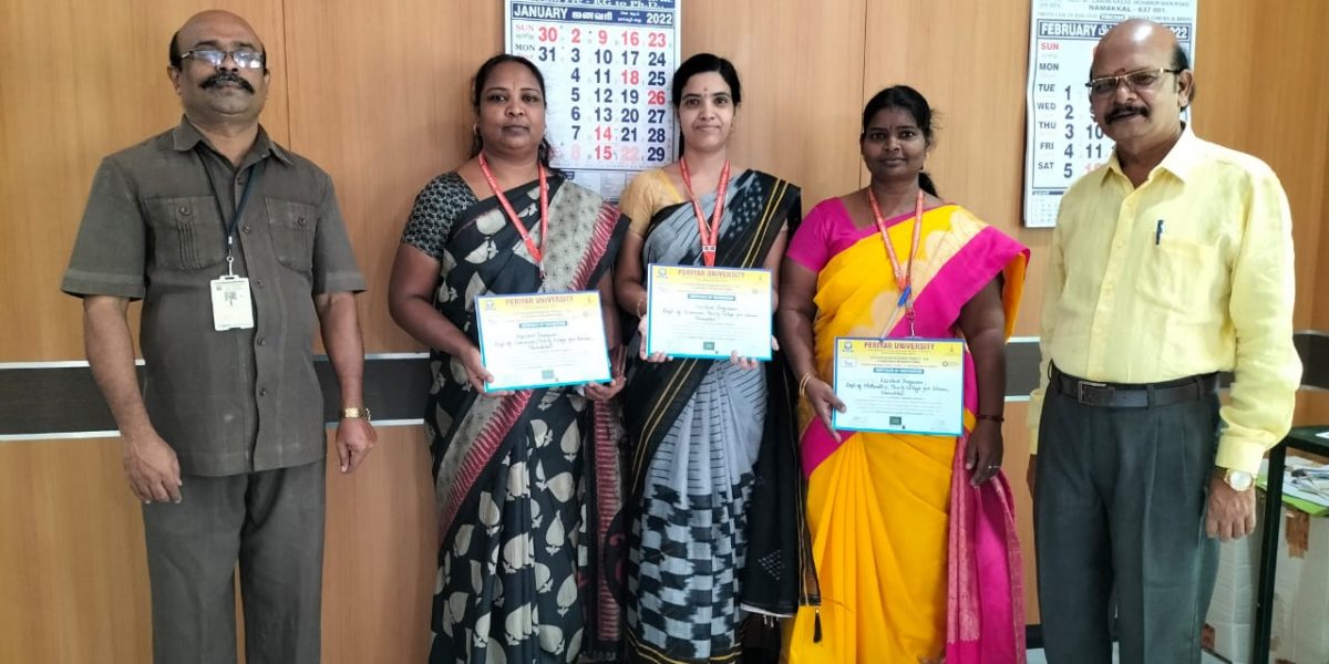 Dr. N. Elamathi, Mrs. S. Usharani and Ms. S. Poornima are congratulated by Mr. P.K. Sengodan, Chairman, Er. K. Nallusamy, Secretary, Dr. M.R. Lakshiminarayanan, Principal, Dr. Arasuparameswaran, Director – Academic, Mr. N.S. Senthilkumar, Administrative Officer and the faculty members of Computer Science & English.