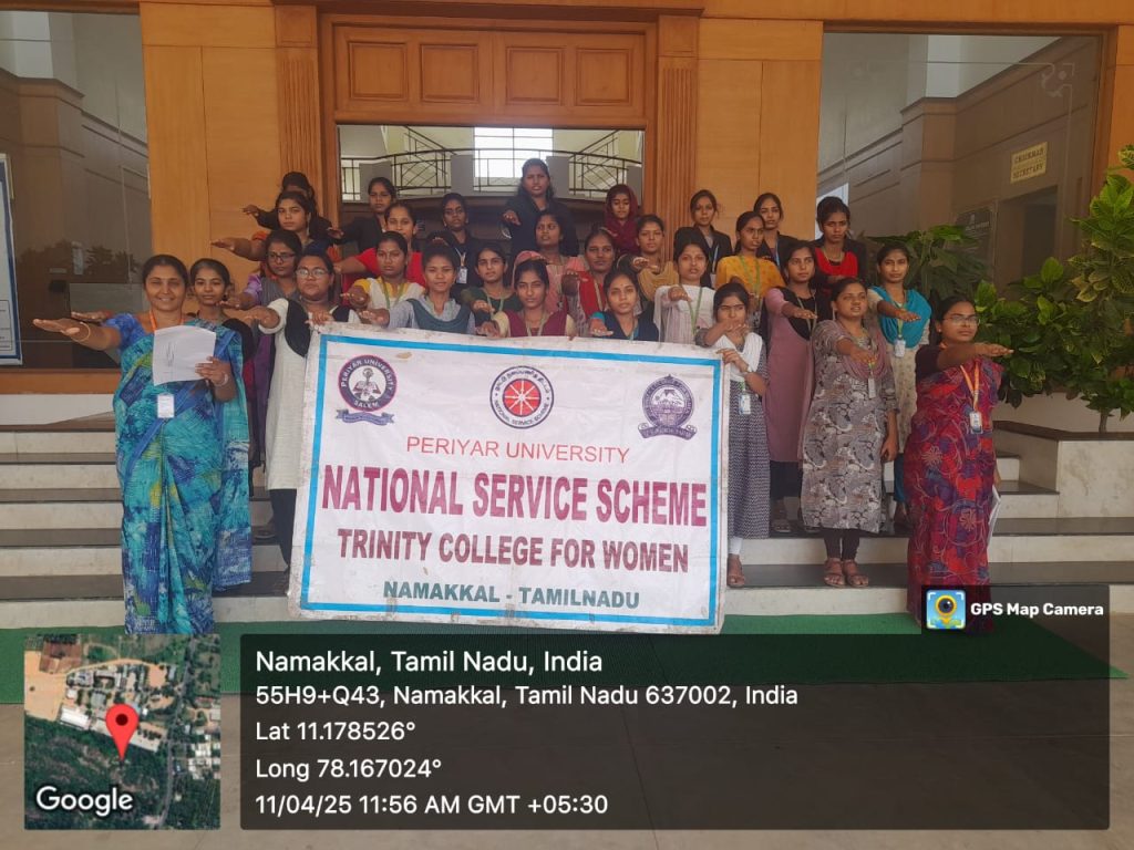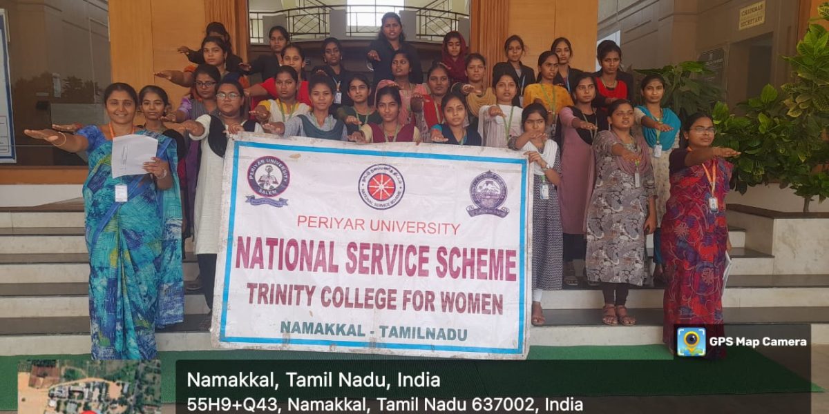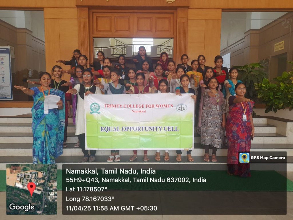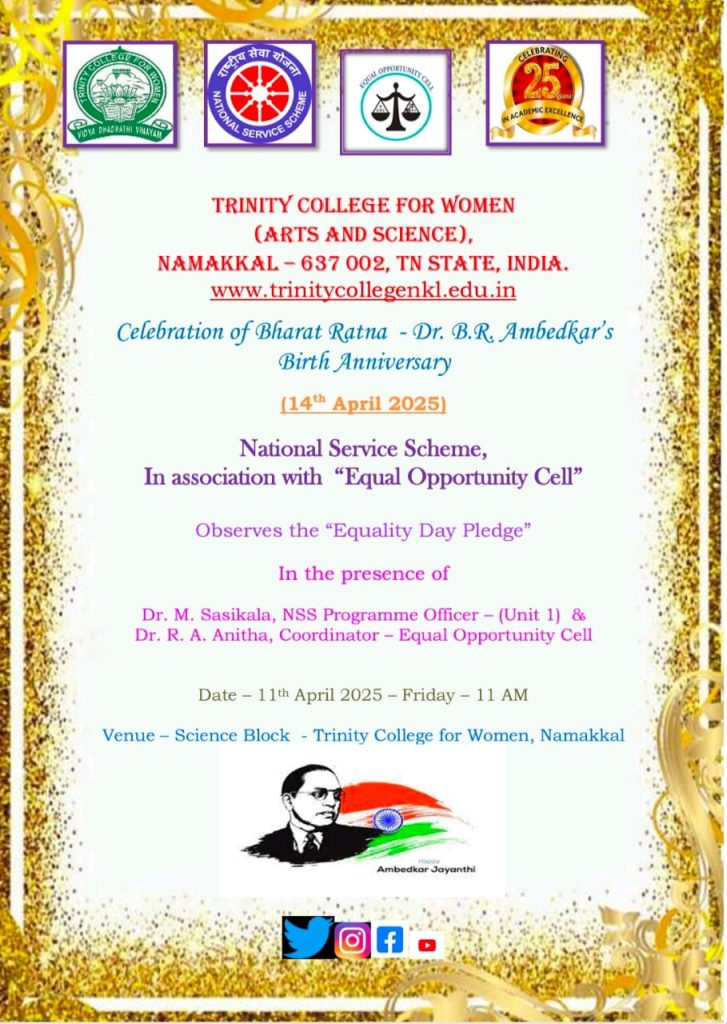 All the volunteers of the National Service Scheme and the Equal Opportunity Cell of the college took the Equality Day Pledge on 11th April 2025. The NSS Programme Officer, Dr. M. Sasikala and Dr. R.A. Anitha, Coordinator – Equal Opportunity Cell, Trinity College for Women, Namakkal, made arrangements.