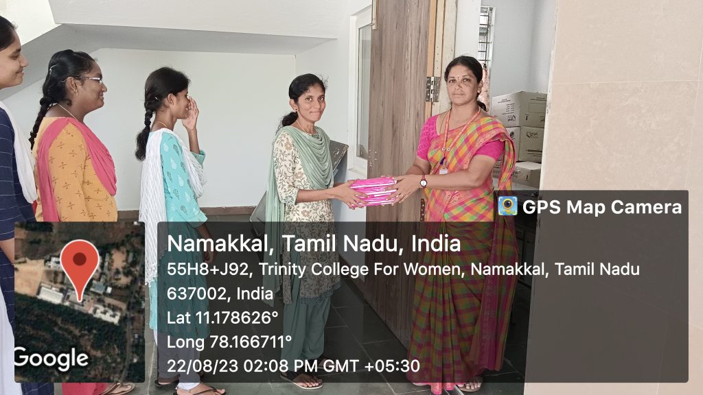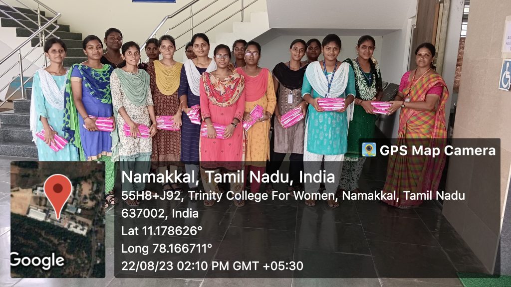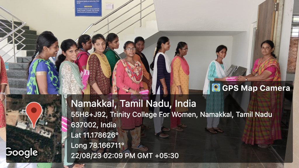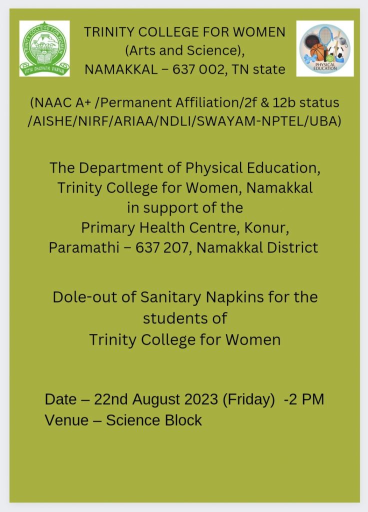 Trinity College for Women, Namakkal, under the aegis of the department of Physical Education and in support of the Primary Health Centre, Konur, Paramathi Via, Namakkal District, initiated a sanitary napkin distribution drive on August 22, 2023, to ensure underprivileged women live with dignity. Under the supervision of Mrs. V. Archana, Physical Director, Trinity College for Women, Namakkal, sanitary napkins distributed to the students of our College. She pointed out the benefits of sanitary napkins for the adolescent girls, and she also conveyed thanks to the officials and the medical practitioners of the Primary Health Centres of Konur for their continuous support of our Institution.