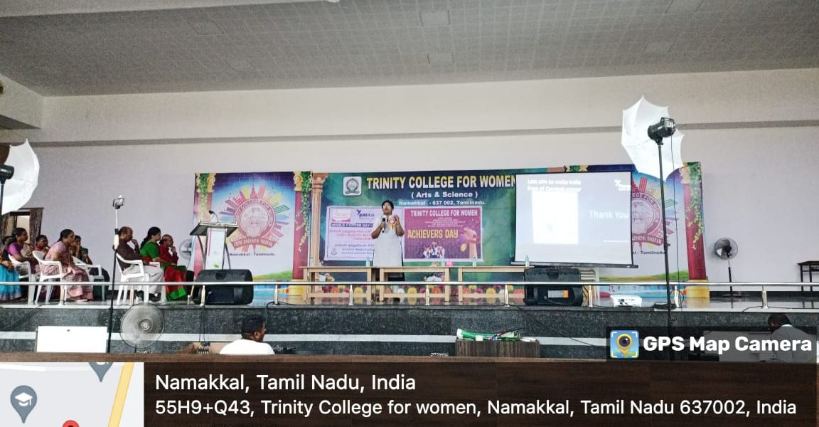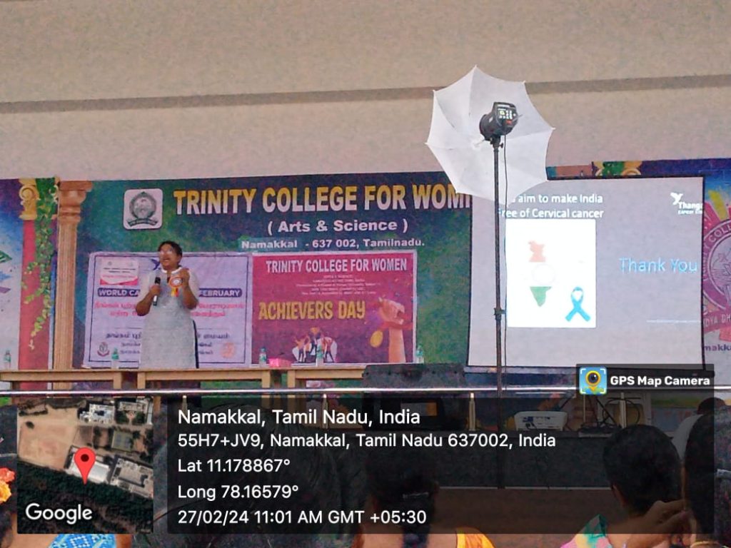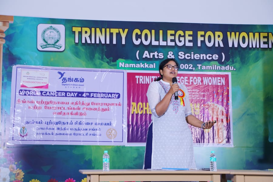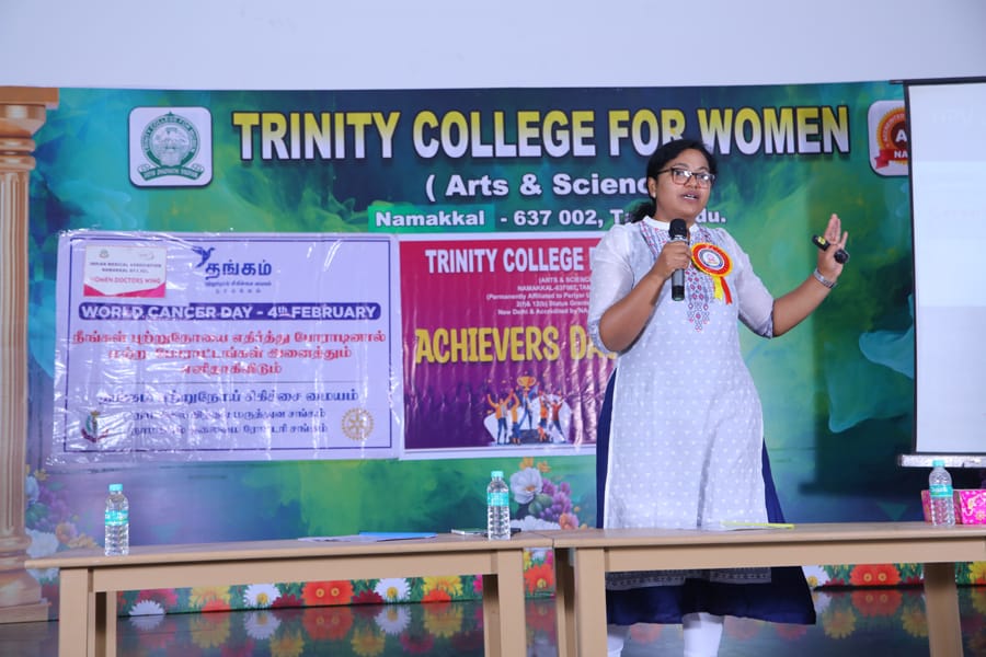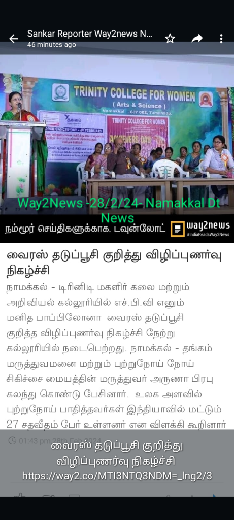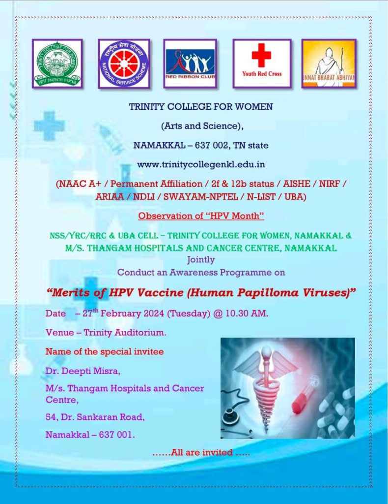 Trinity Women’s Forum, National Service Scheme, Youth Red Cross, Red Ribbon Club, and Unnat Bharat Abhiyan Cell, Trinity College for Women, Namakkal, in support of Thangam Hospitals and Cancer Centre, Namakkal jointly conducted an awareness program on “Merits of HPV (Human Papilloma Viruses)” on February 27, 2024, in the premises of Trinity Auditorium. Dr. Aruna Prabhu, Surgical Oncologist, Thangam Hospital and Cancer Centre, Namakkal was the special invitee. This HPV vaccine protects us against mouth, throat, head and neck cancers caused by Human Papilloma Viruses, she pointed out.