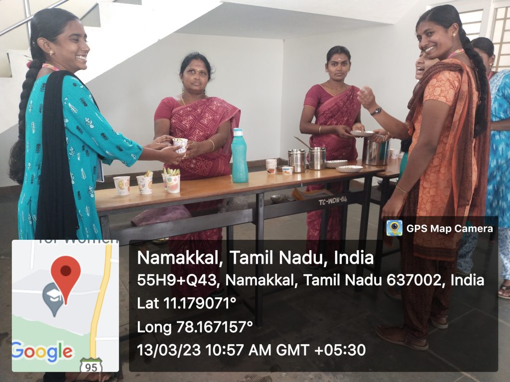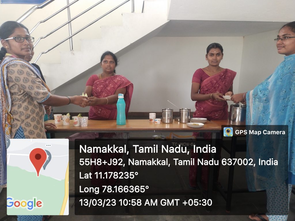 Now, many people are shifting to natural foods on account of providing multiple health benefits. In this subject, because of emphasis on natural food, on behalf of Unnat Bharat Abhiyan Cell, Trinity College for Women, Namakkal organized a one day programme entitled “Sale of the food products – Sale of natural food liquid products” – Aloe Vera Juice (சோற்றுக் கற்றாழைச் சாறு), Banana Stem Juice (வாழைத்தண்டுச்சாறு), Young Palmyra Fruit (பனை நுங்கு) & Tender Coconut Water (தேங்காய் இளநீர்) on 13.03.2023. It was held in the premises of the Science Block at Trinity College for Women. Many students of the College enthusiastically particiapted and bought their natural foods. This programme was organized for the benefit of female farmers of Vagurampatti (UBA adopted village) in Namakkal district.