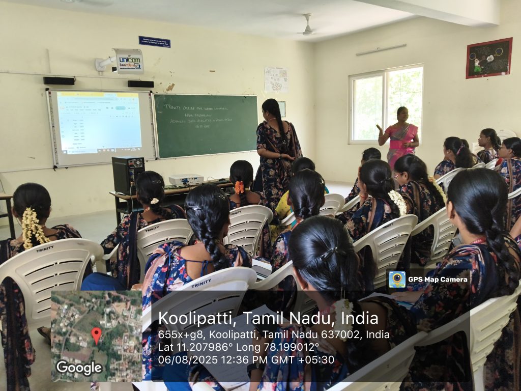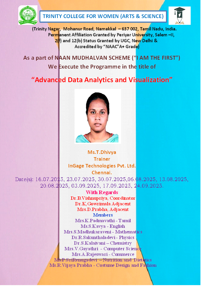 Under the aegis of Naan Mudhalvan, Trinity College for Women, Namakkal conducted “Naan Mudhalan Programme titled “Advanced Data Analytics and Visualization” on 16th, 23rd, 30th July, 6th, 13th, 20th, August, 3rd, 17th & 24th September 2025.