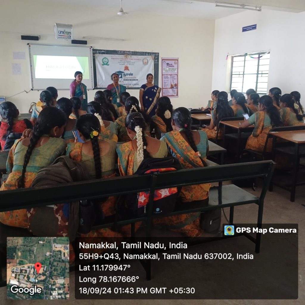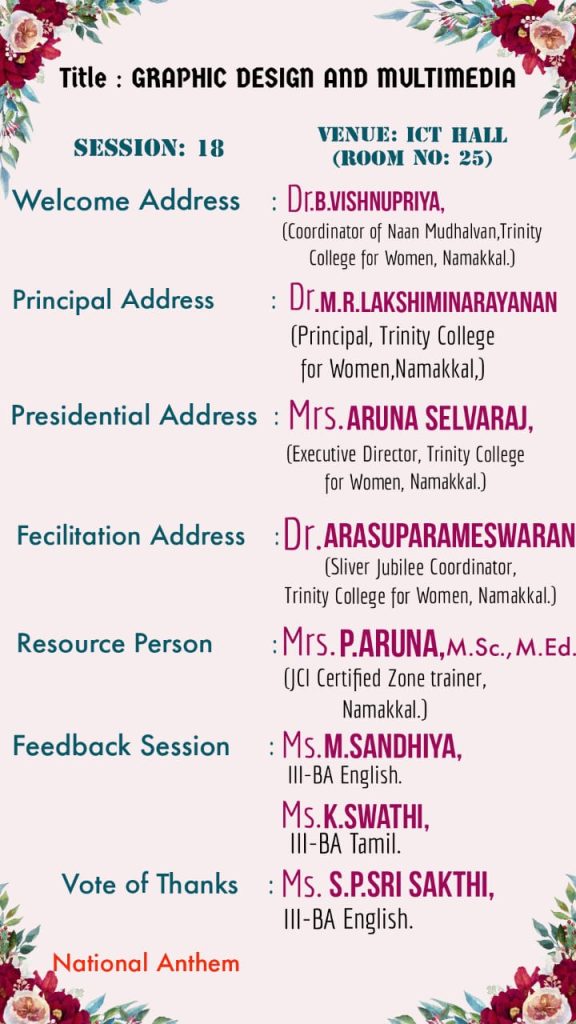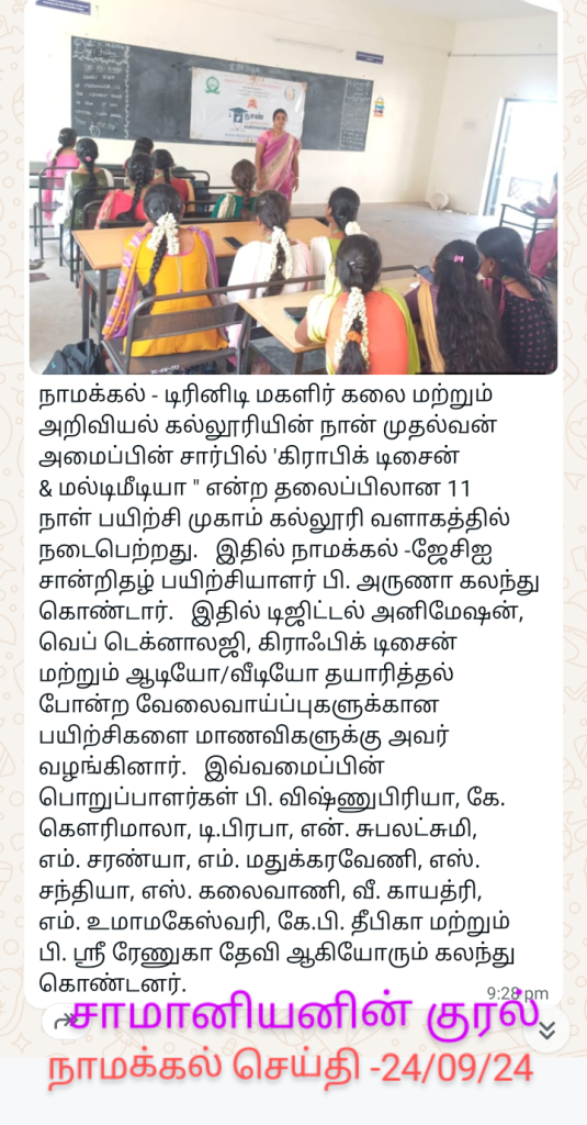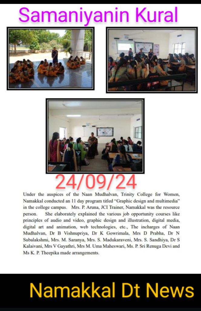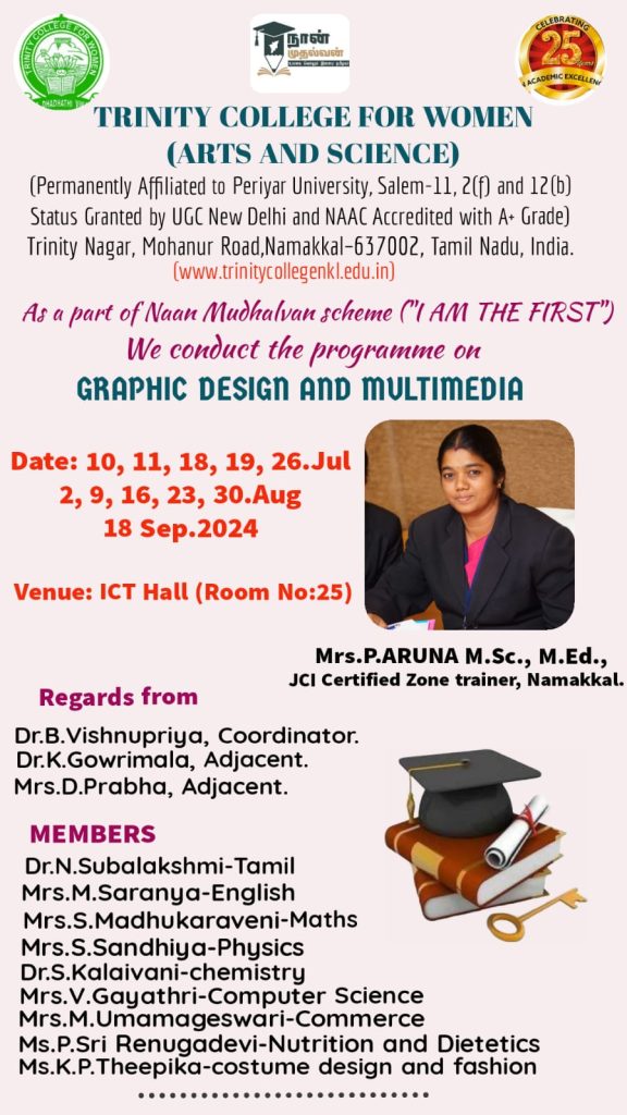 Under the auspices of Naan Mudhalvan, Trinity College for Women, Namakkal conducted a 11 day programme titled “Graphic Design and Multimedia” on the date (s) of 10, 11, 18, 19 & 26th July, 02, 09, 16, 23 & 30th August and 18th September 2024. Mrs. P. Aruna, JCI Certified Zone Trainer, Namakkal was the resource person. She enunciated the various various graphic design and multimedia topics like principles of audio & video, graphic design & illustration, digital media, digital art and animation, web technologies, etc.,