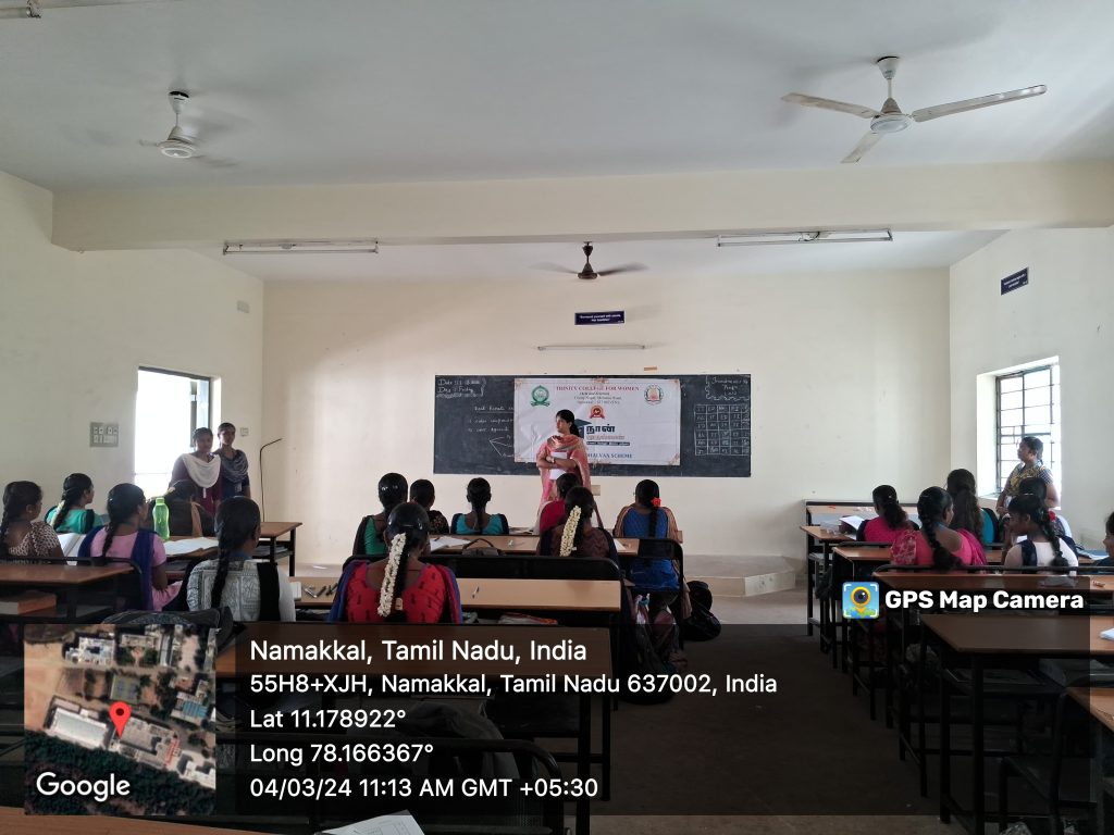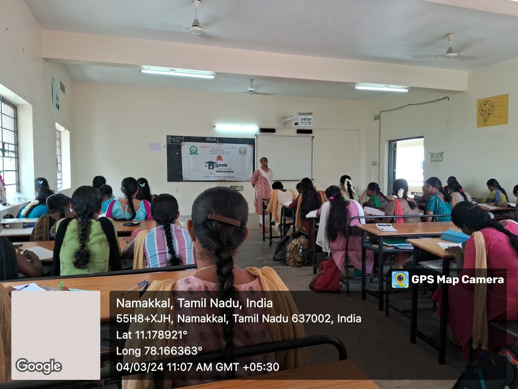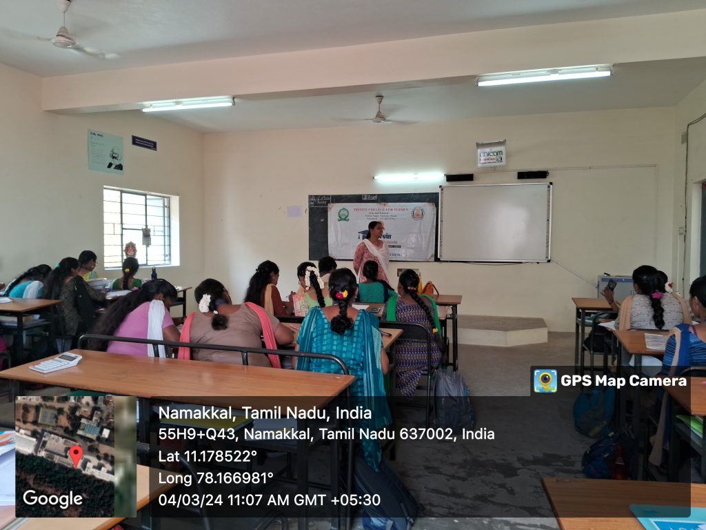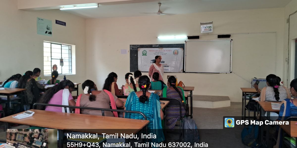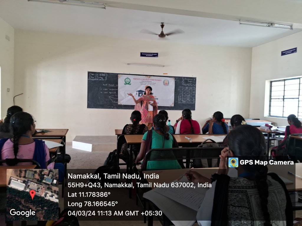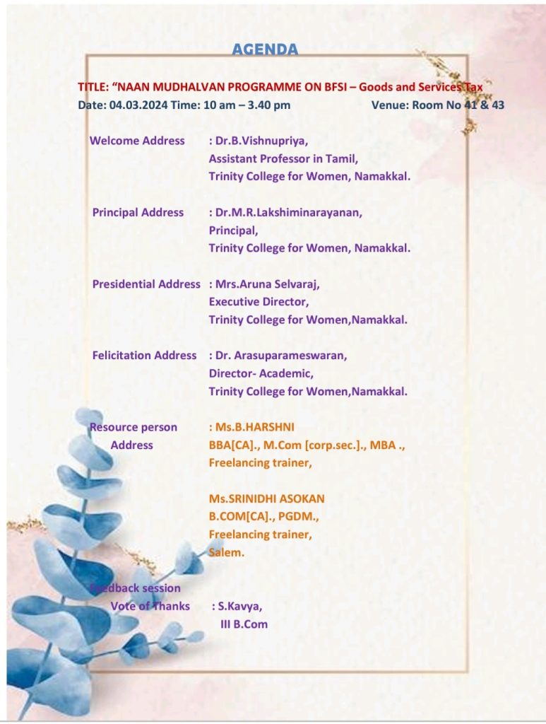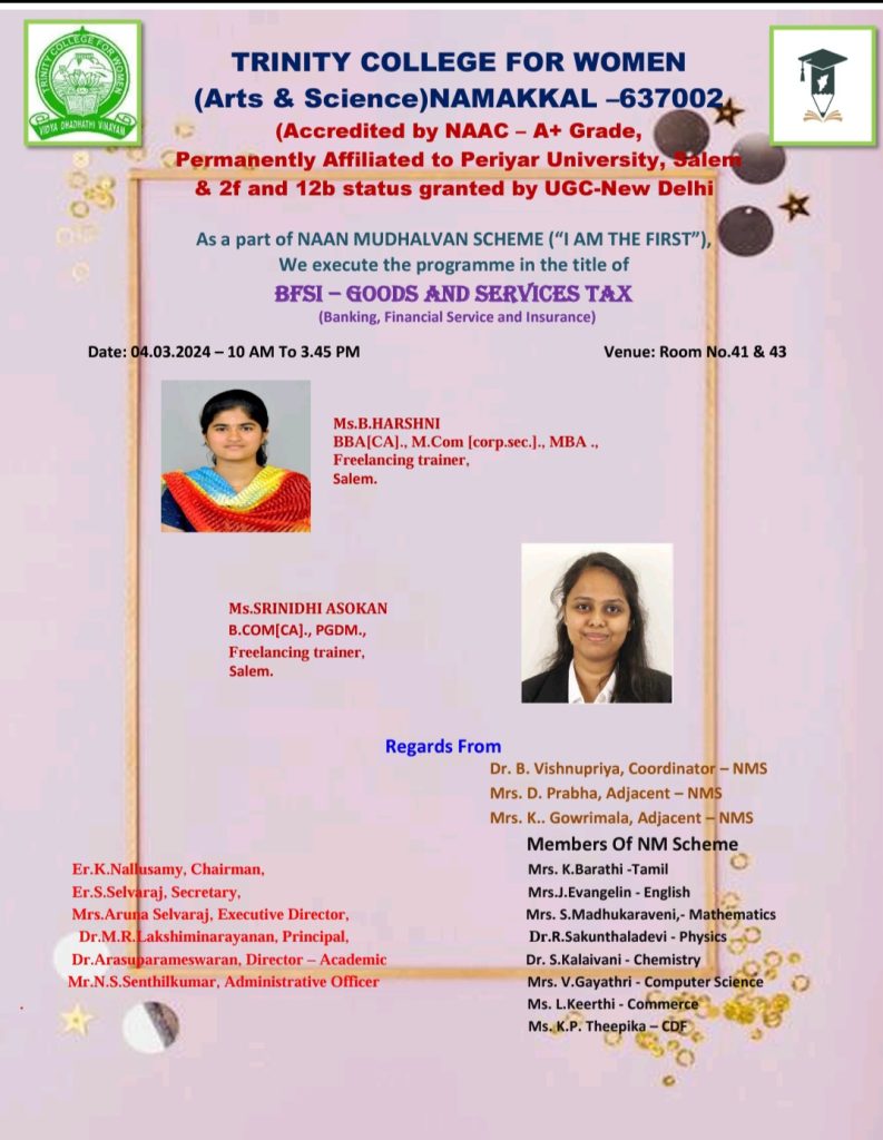 Under the auspices of Naan Mudhalvan, Trinity College for Women, Namakkal conducted a program titled “BFSI (Banking, Financial Services, and Insurance): Goods and Services Tax” on March 4, 2024, in the college premises. Ms. B. Harshini and Ms. Srinidhi Asokan and trainers, Freelancing, and Salem were the resource persons.