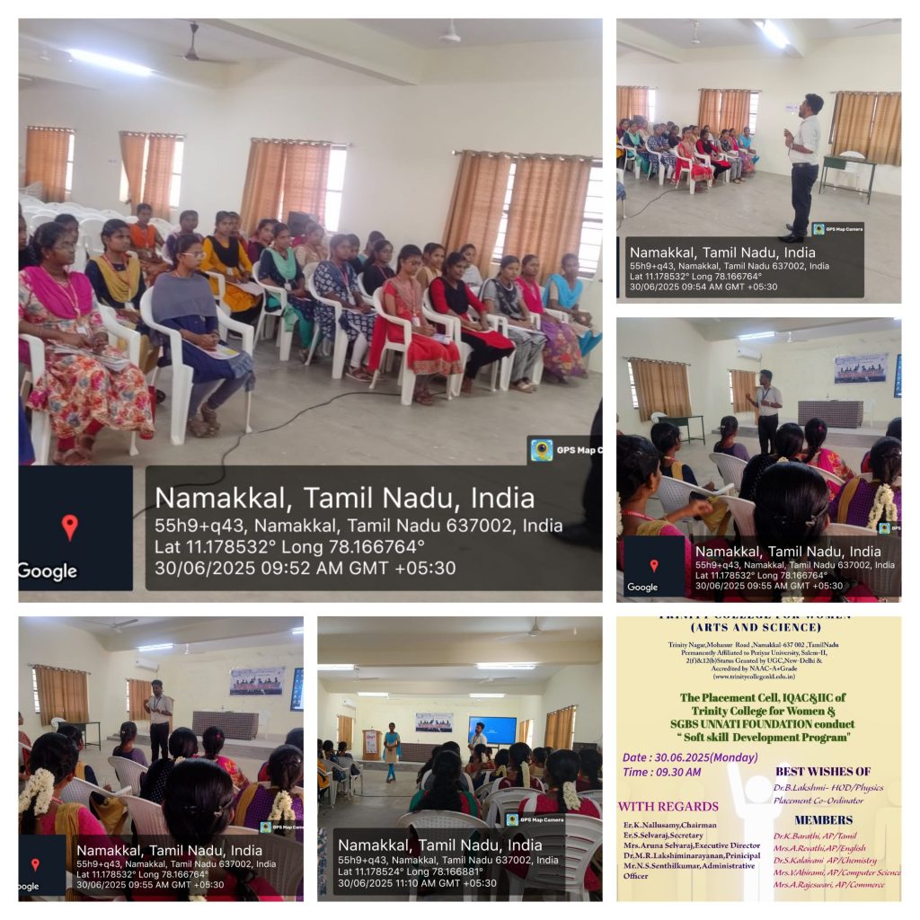 Under the auspices of Placement Cell, Internal Quality Assurance Cell and Institution’s Innovation Council, Trinity College for Women, Namakkal & SGBS Unnati Foundation, Bengaluru jointly organized the soft skill development programme on 30th June, 02nd, 03rd, 04th, 7th, 9th , 10th, 11th , 14th July 2025 in the seminar hall.