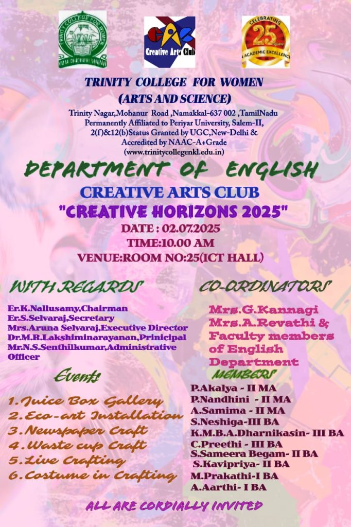 Under the auspices of the Department of English, Creative Arts Club of Trinity College for Women, Namakkal conducted a one-day event titled “Creative Horizons 2025” on 02nd July 2025.