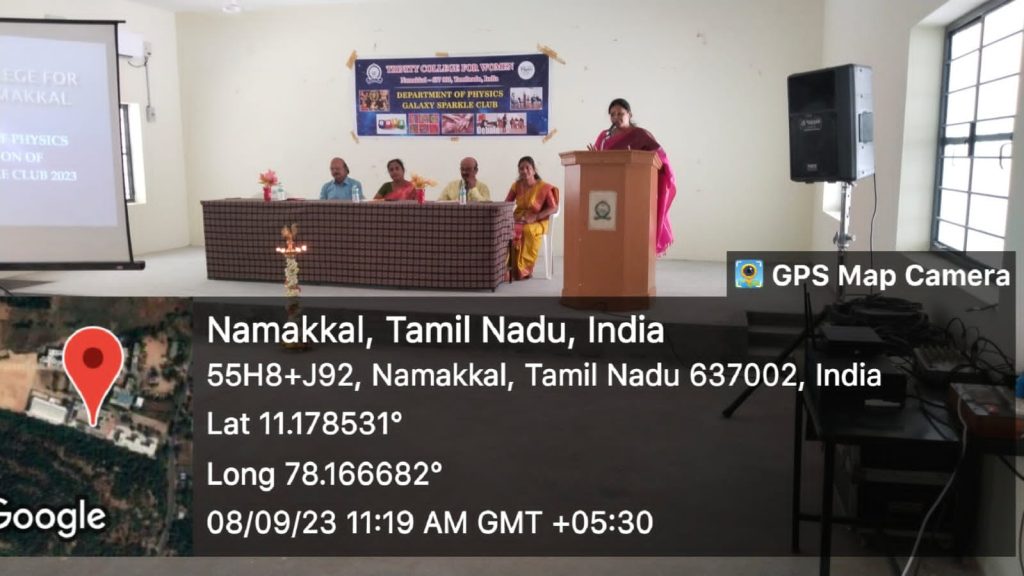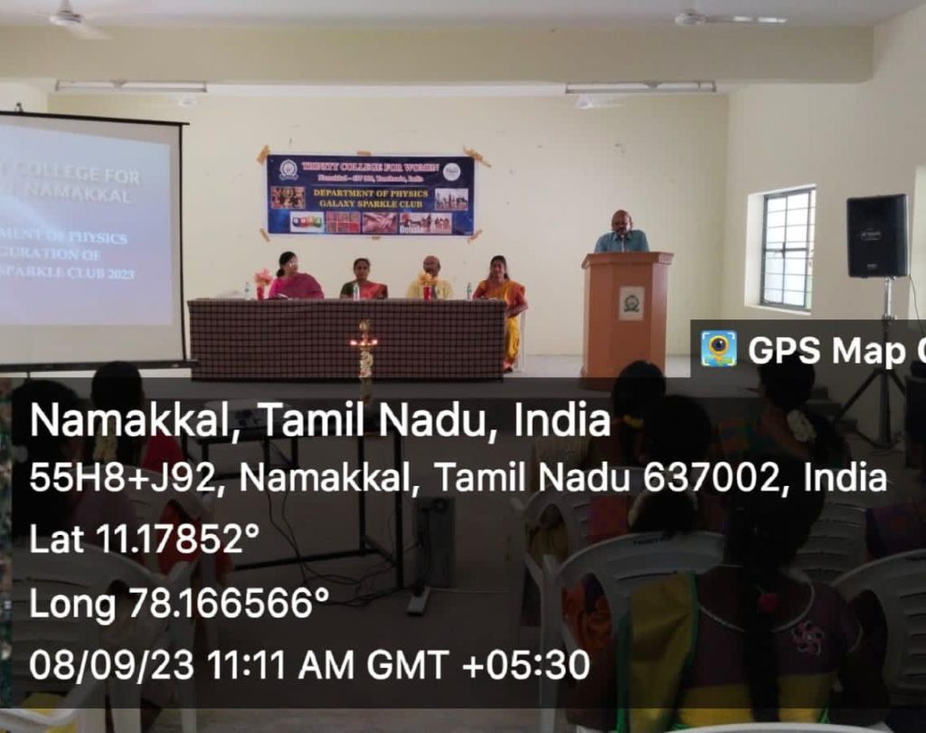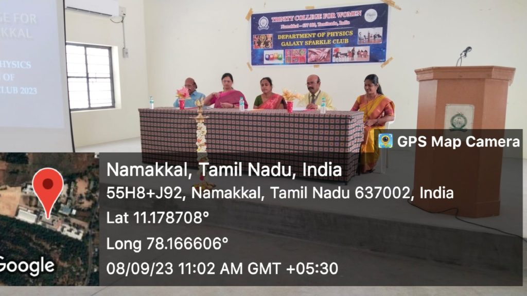 Under the auspices of the department of physics at Trinity College for Women, Namakkal, Galaxy Sparkle Club 2023″ was inaugurated by Dr. P. Sathya, Assistant Professor in Physics, Salem Sowdeswari College (For Women), Salem, on September 8, 2023. Also, she delivered the talk under the title “Optical Physics Facts. The sun is the natural source for the production of electromagnetic radiation. Rectilinear propagation of light is pinhole photography, the formation of shadows, and eclipses. This light travels from the source in a straight line. It cannot travel through an opaque medium, she said. Also, she elaborated on the radio wave, microwave, infrared, visible, UV, X-ray, and gamma-ray.
