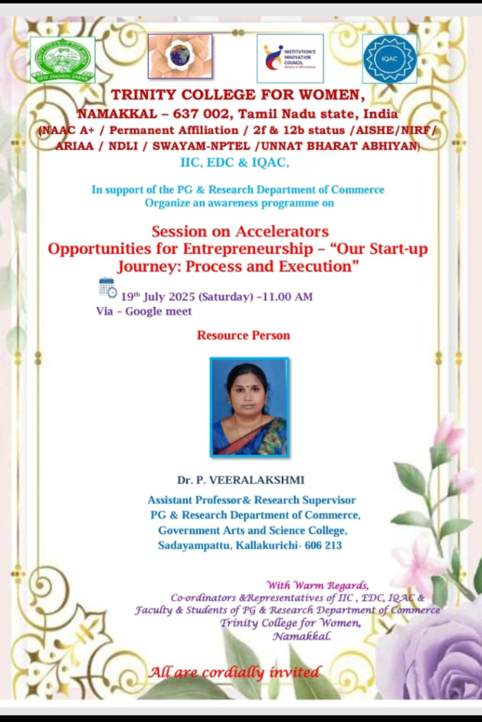 Under the auspices of the Institution’s Innovation Council, Entrepreneurship Development Cell and Internal Quality Assurance Cell, in association with the Department of Commerce, Trinity College for Women, Namakkal organized a webinar programme titled “Session on Accelerators Opportunities for Entrepreneurship – Our Start-up journey – Process and Execution” on 19th July 2025.