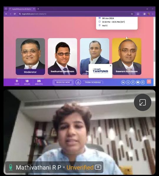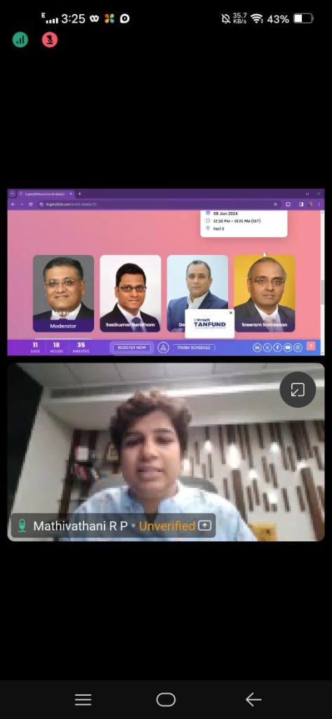 On behalf of Trinity College for Women, Namakkal, Ms. M. Sandhiya, Second Year B.A., English degree (Student Corporate Ambassador), took part in the Tamil Nadu Global Investors Meet 2024 discussion event through the video conferencing of Google Meet.
