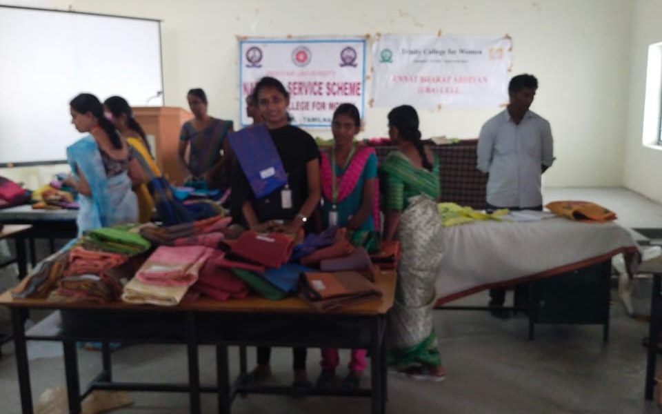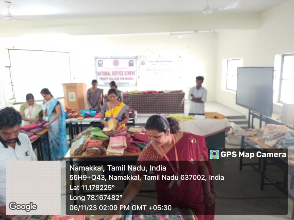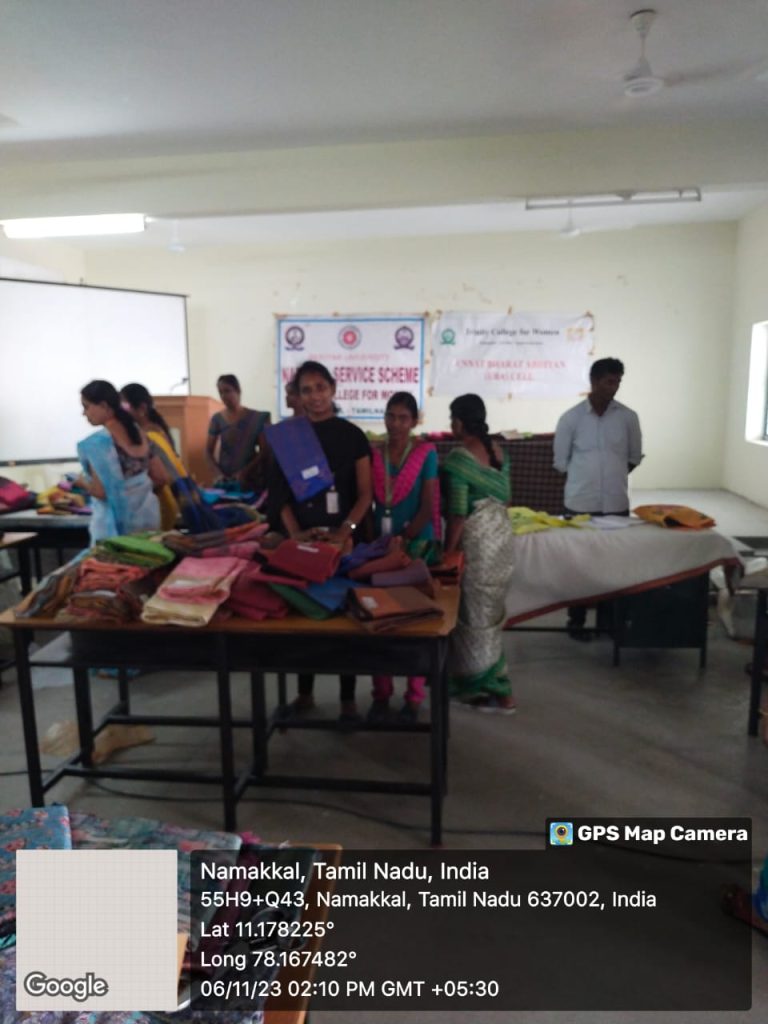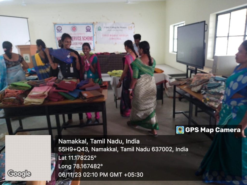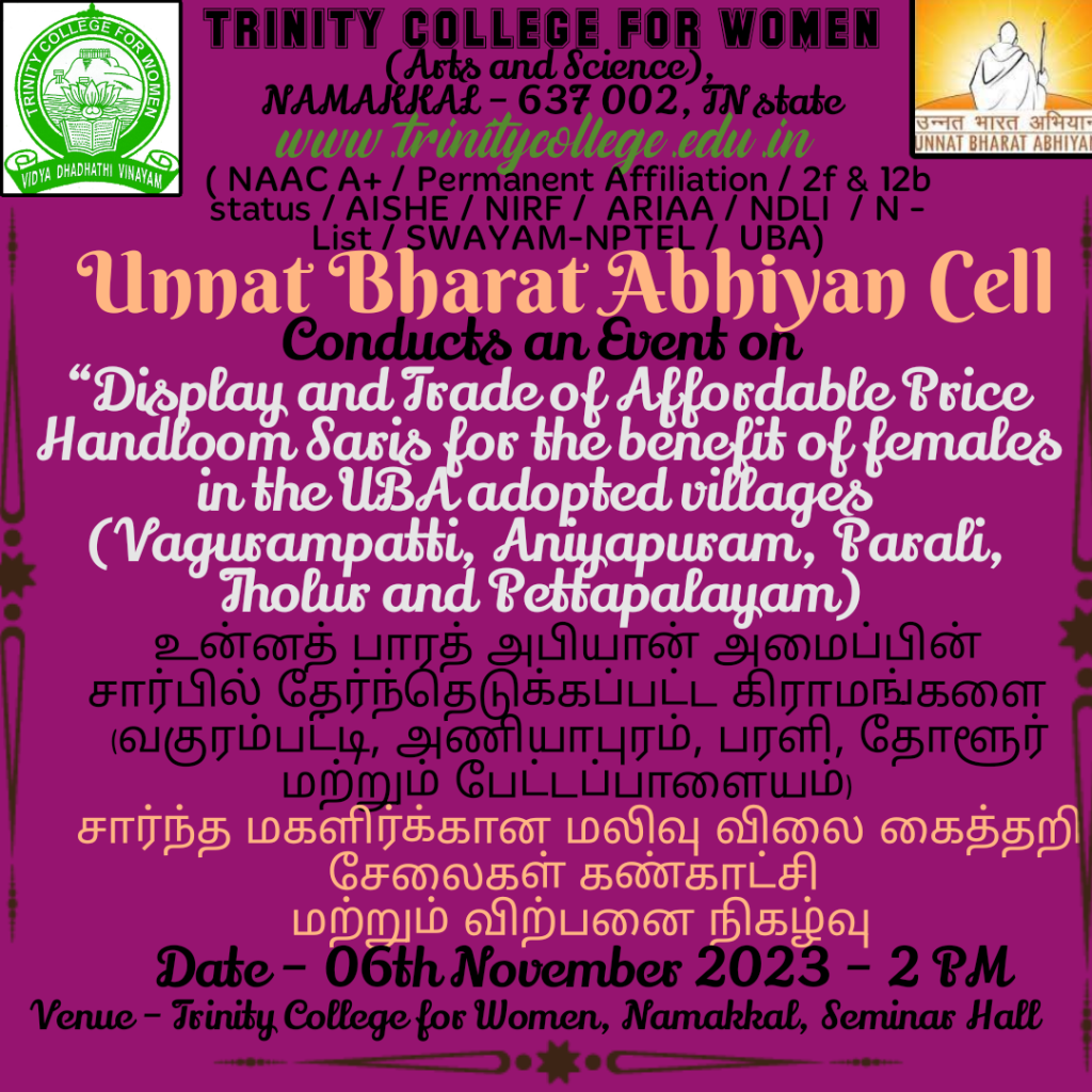 Under the auspices of Unnat Bharat Abhiyan Cell, Trinity College for Women, Namakkal conducted an event entitled ““Display and Trade of Affordable Price Handloom Saris for the benefit of females in the UBA adopted villages (Vagurampatti, Aniyapuram, Parali, Tholur, and Pettapalayam)” (உன்னத் பாரத் அபியான் அமைப்பின் சார்பில் தேர்ந்தெடுக்கப்பட்ட கிராமங்களை (வகுரம்பட்டி, அணியாபுரம், பரளி, தோளூர் மற்றும் பேட்டப்பாளையம்) சார்ந்த மகளிர்க்கான மலிவு விலை கைத்தறி சேலைகள் கண்காட்சி மற்றும் விற்பனை நிகழ்வு) on November 6, 2023, on the college campus.