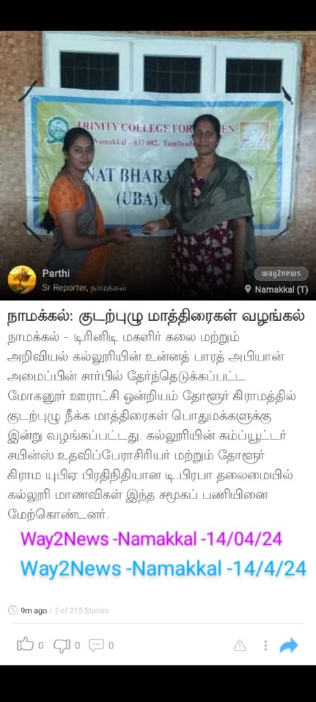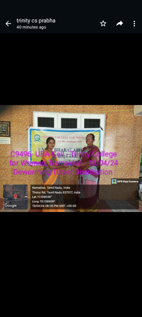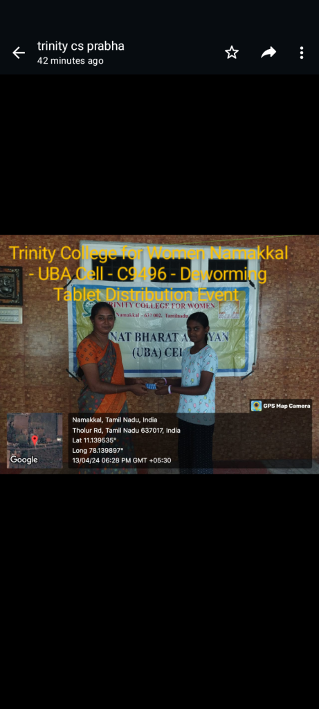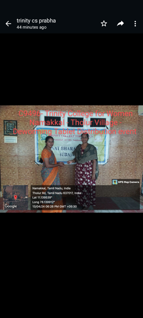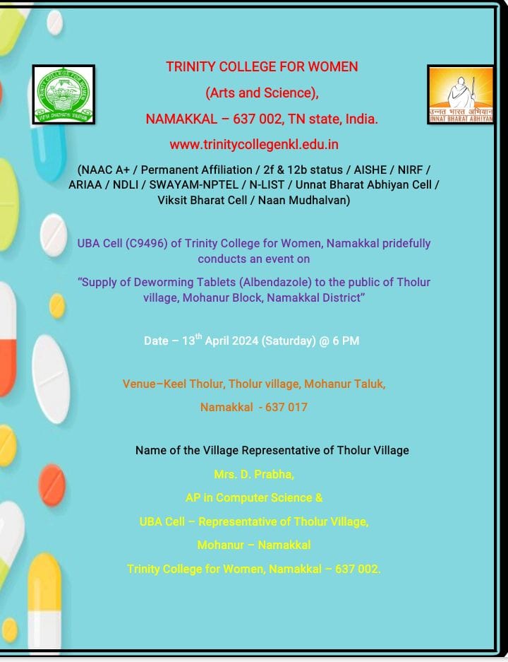 Under the UBA Cell (C9496), Trinity College for Women, Namakkal arranged a program titled “Supply of Deworming Tablets” (Albendazole) to the public of Tholur village, Mohanur Block, Namakkal district. This program was started in Keezh Tholur village on 13th April 2024. Mrs. D. Prabha, Assistant Professor in Computer Science and UBA Cell Village Representative of Tholur village, and her team members (students of the college) visited various houses in these village areas, met the people, and distributed the deworming tablets to them.