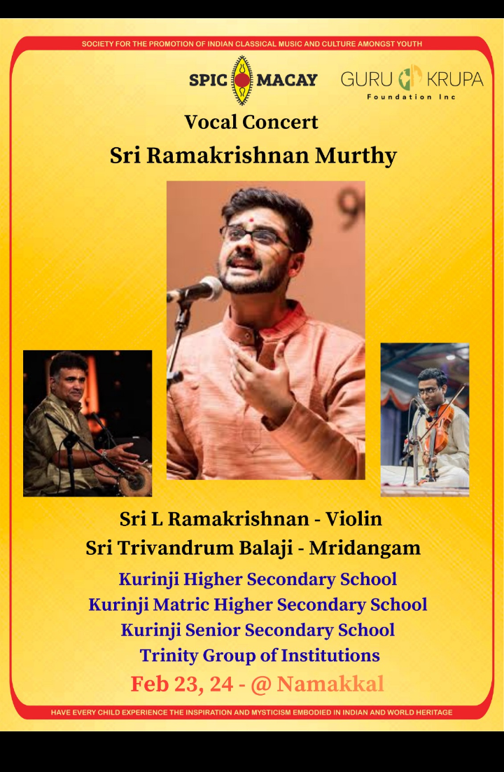 A renowned Carnatic Music Vocalist, Sri Ramakrishna Murthy presented a vocal concert on 23rd February 2026 in the Trinity Auditorium, organized by Trinity Matric Higher Secondary School, Trinity CBSE (International) School and Trinity College for Women, Namakkal, with the support of SPIC MACAY & Guru Krupa Foundation, Inc.