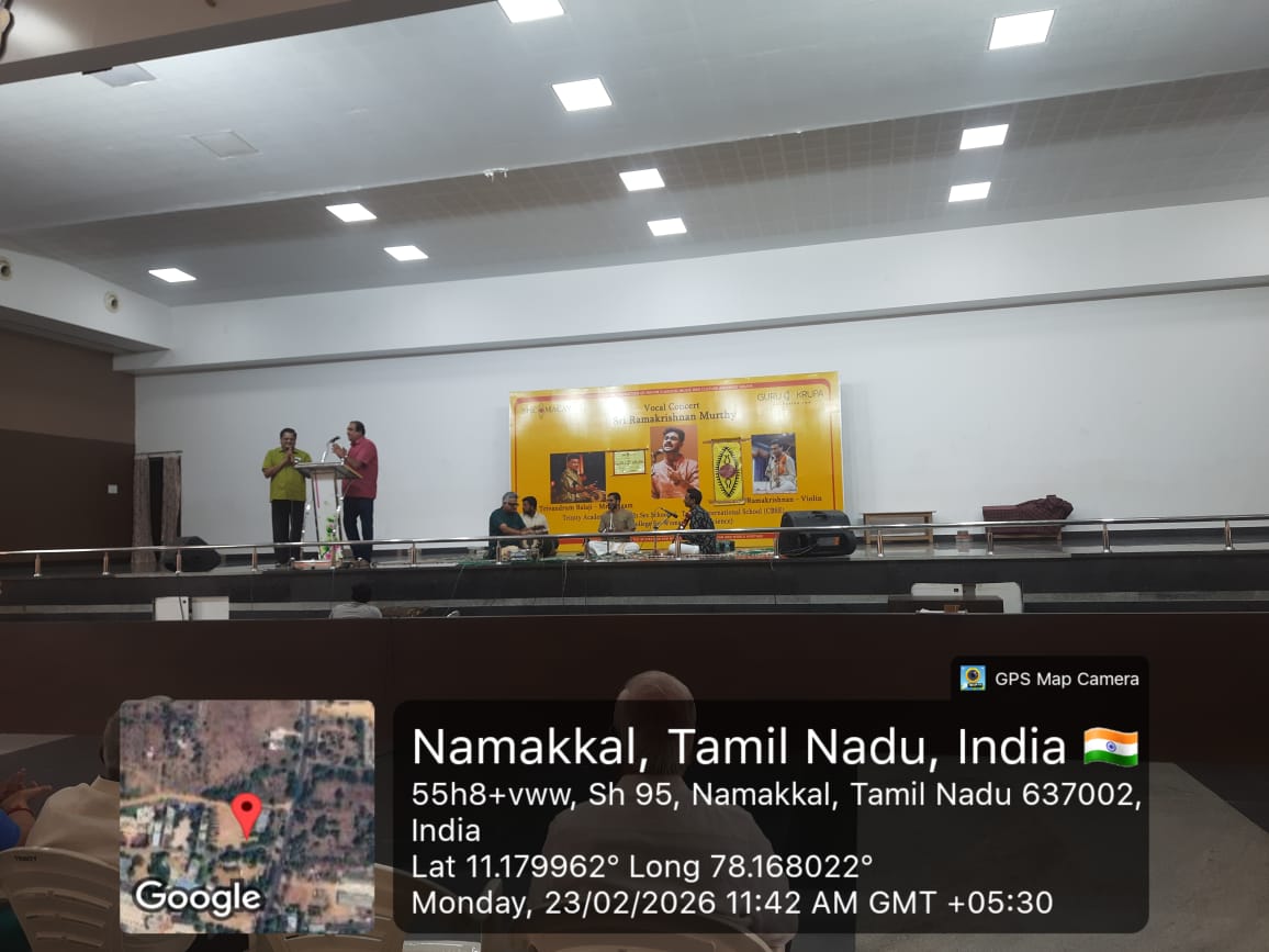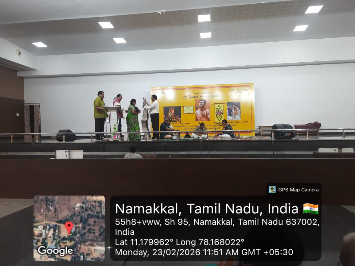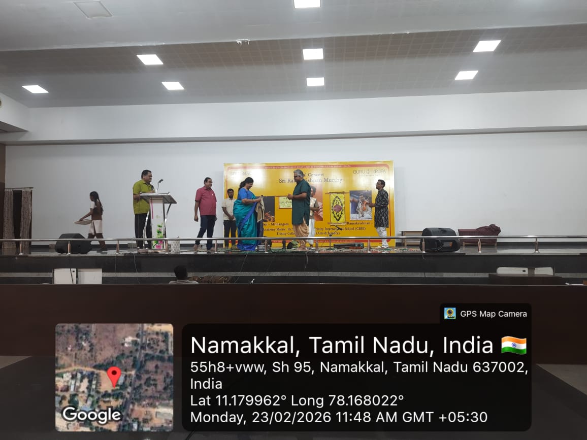 A renowned Carnatic Music Vocalist, Sri Ramakrishna Murthy presented a vocal concert on 23rd February 2026 in the Trinity Auditorium, organized by Trinity Matric Higher Secondary School, Trinity CBSE (International) School and Trinity College for Women, Namakkal, with the support of SPIC MACAY & Guru Krupa Foundation, Inc.
