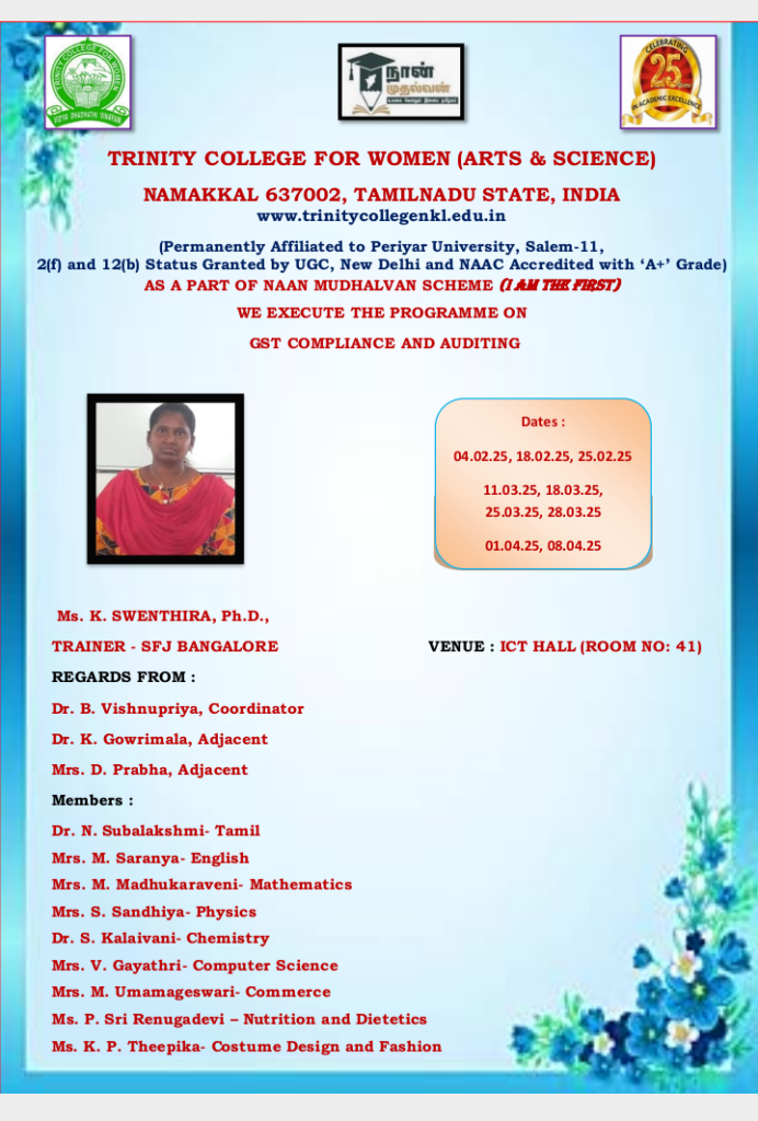 With the support of “Naan Mudhalvan”, Trinity College for Women, Namakkal, conducted a programme titled “GST Compliance & Auditing” on 04th February, 18th February, 25th February, 11th March, 18th March, 25th March, 28th March, 01st April and 08th April 2025.