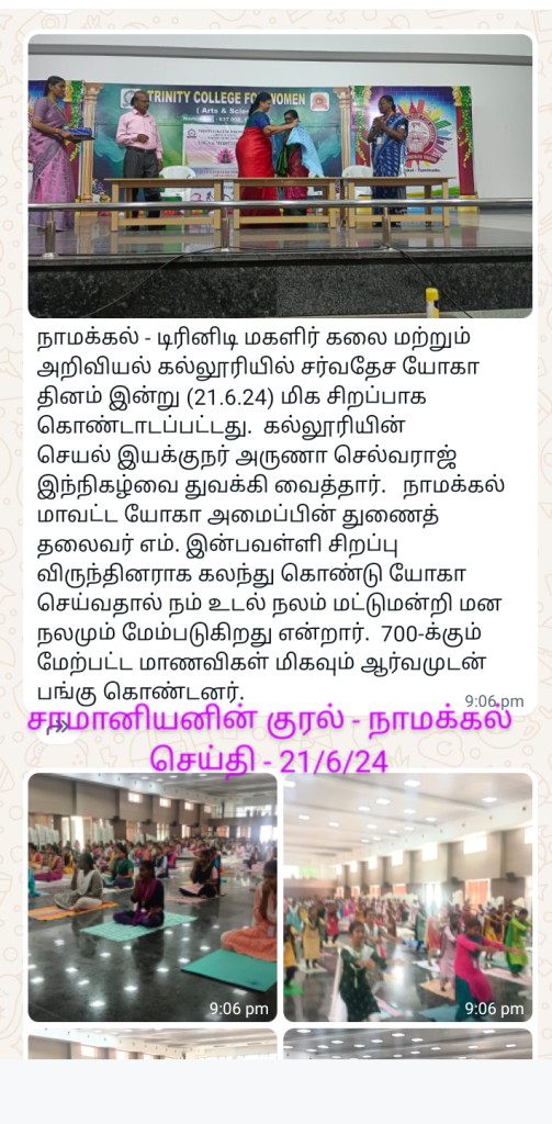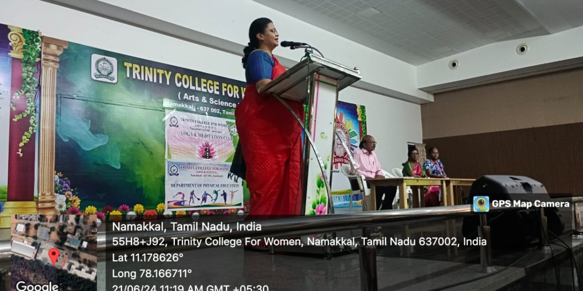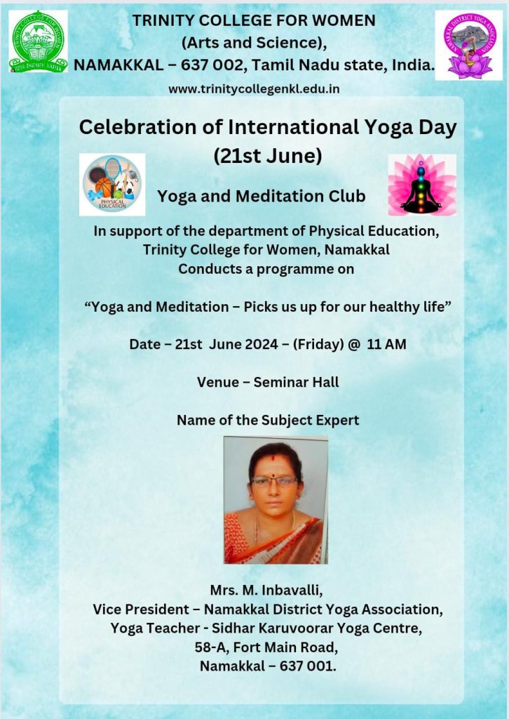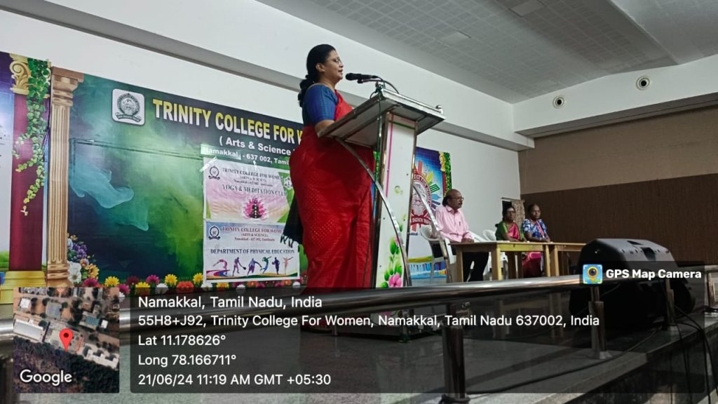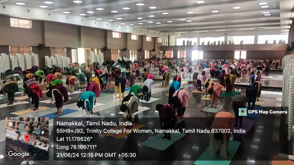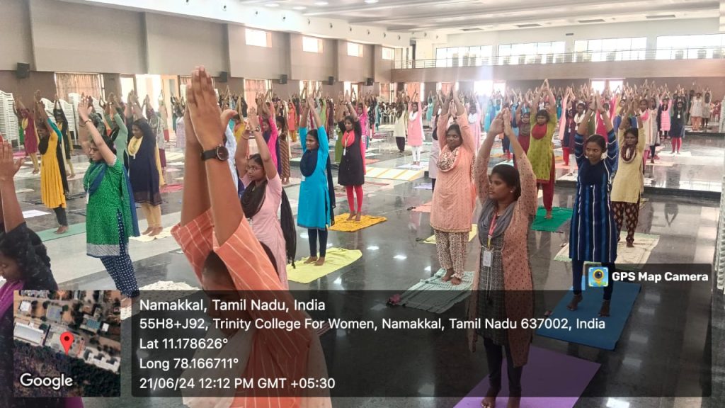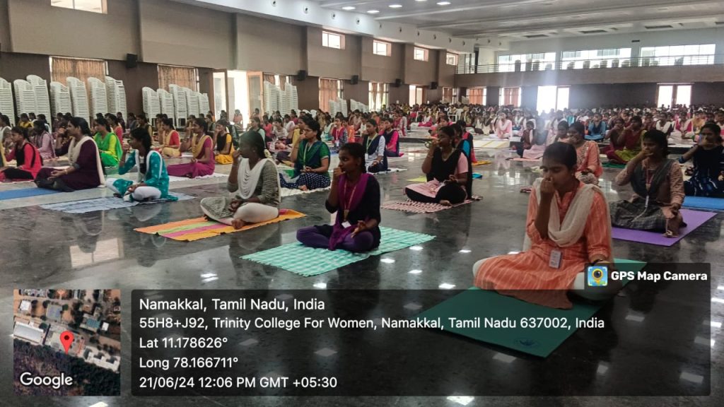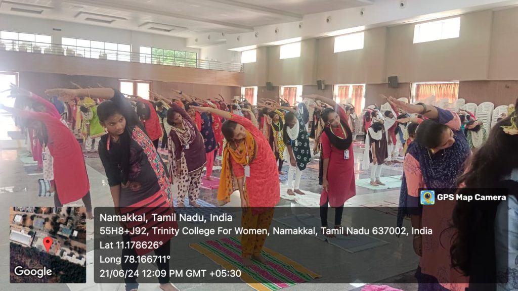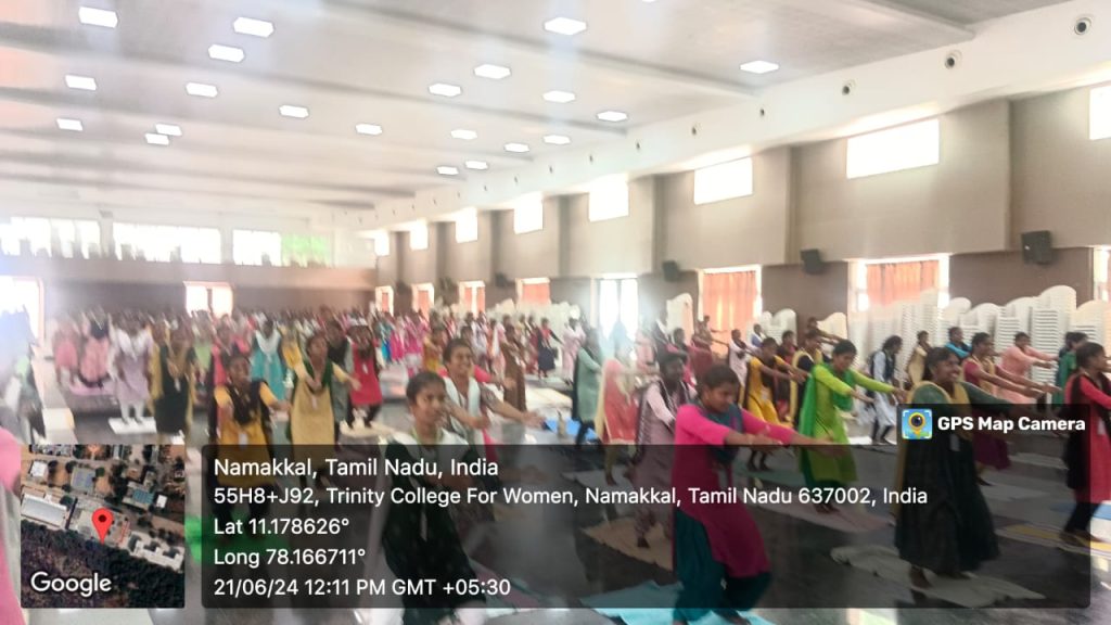 As a consequence of the celebration of international yoga day (21st June), yoga and meditation club and in the support of the department of Physical Education, Trinity College for Women, Namakkal conducted a programme on “Yoga and meditation – pick us up for our healthy life” on 21st June 2024.