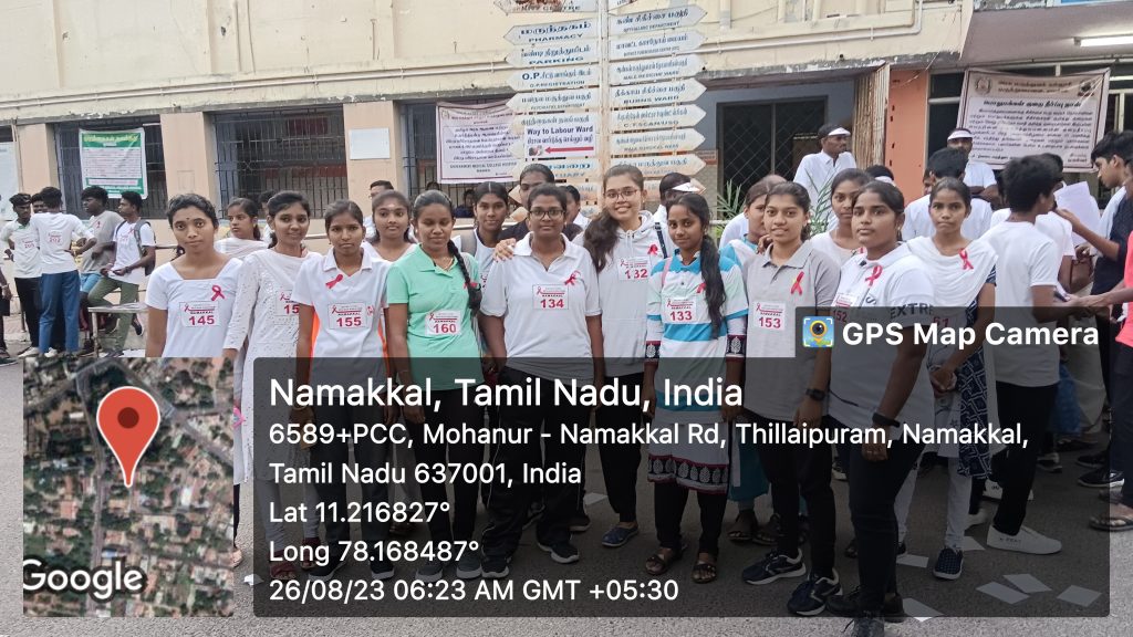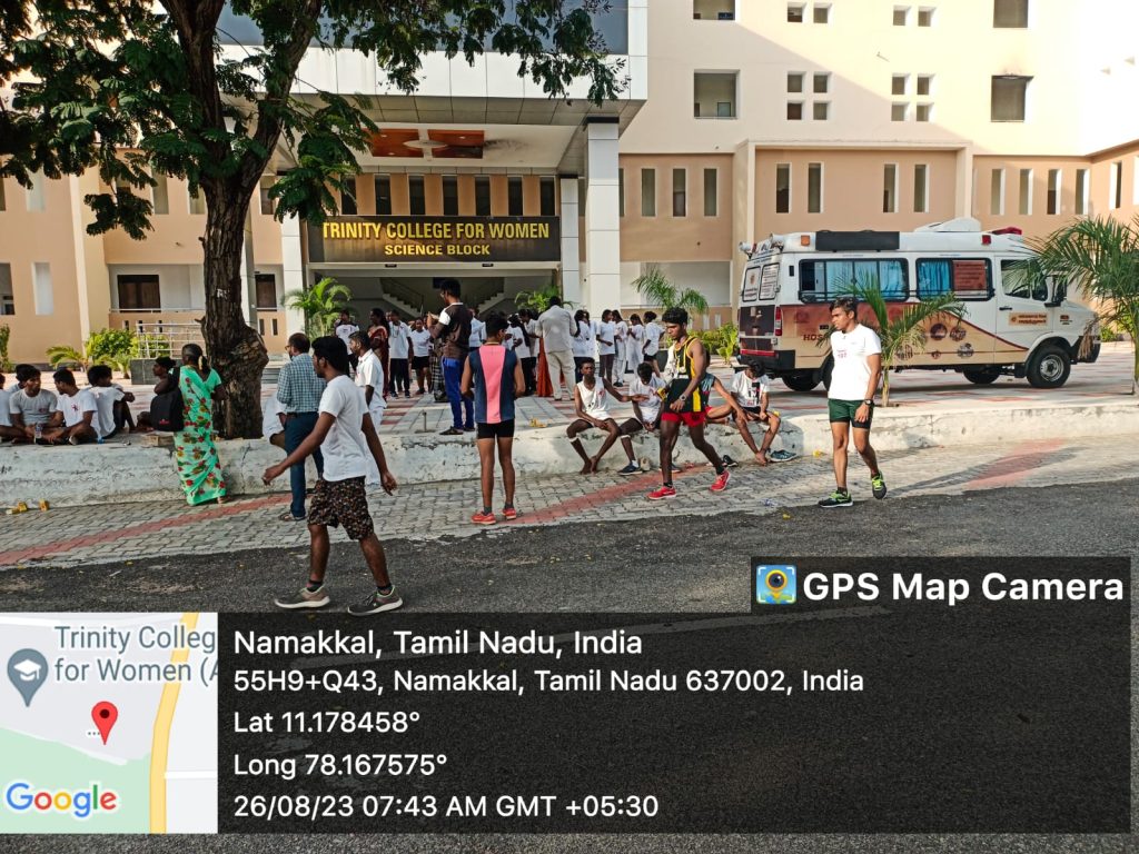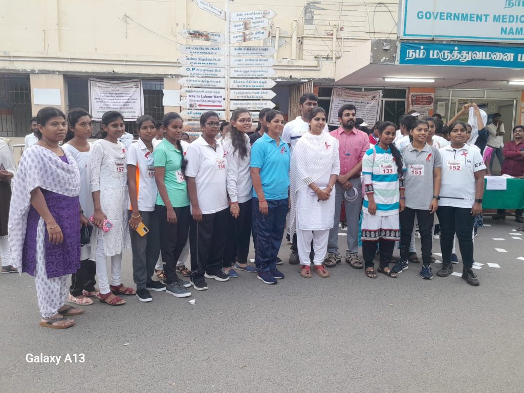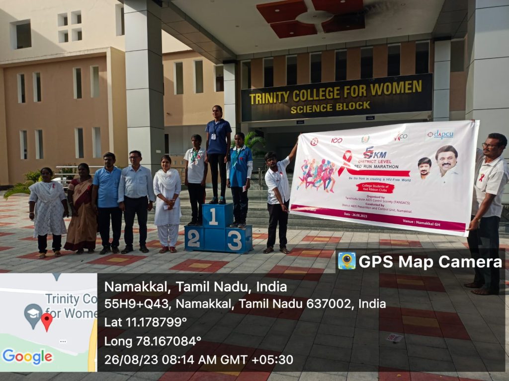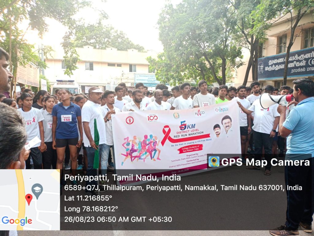 The Tamil Nadu State AIDS Control Society conducted a 5-kilometre Red Run Marathon on August 26, 2023. The title of the event is “Youth Fest 2023-2024. This 5-kilometre marathon started from Mohanur Road (Namakkal Government Hospital) and ended on the campus of Trinity College for Women, Namakkal.